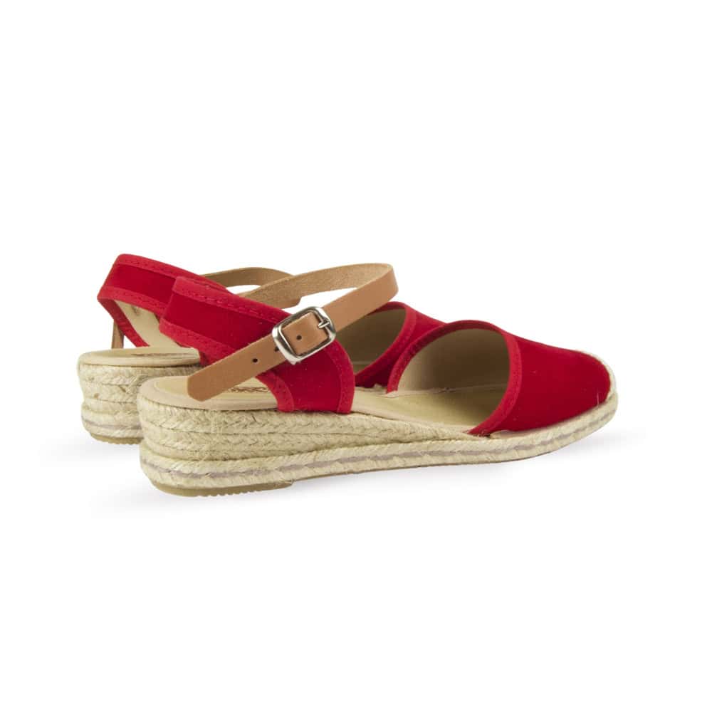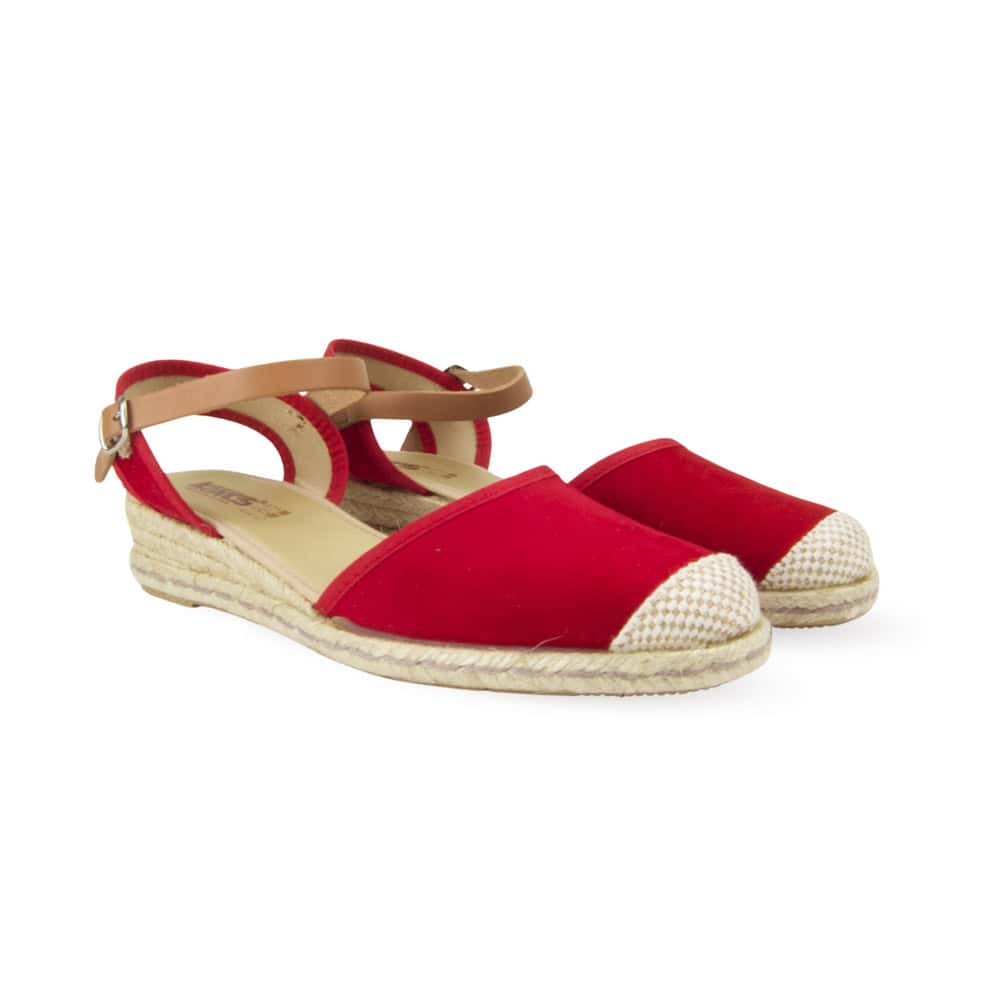 Alpargata de mujer en color rojo, fabricada en suave antelina, ideal para los meses de primavera y verano. Este modelo 4342 de la marca Kokis cuenta con puntera cerrada y talonera cerrada, proporcionando una mayor sujeción y comodidad en cada paso. Pulsera tobillera con hebilla ajustable.