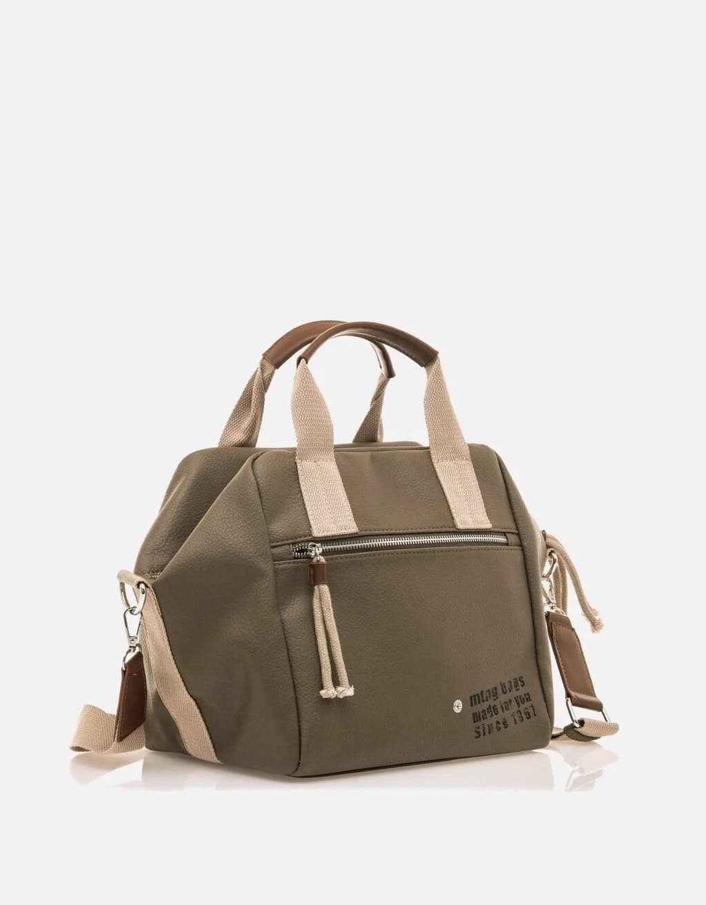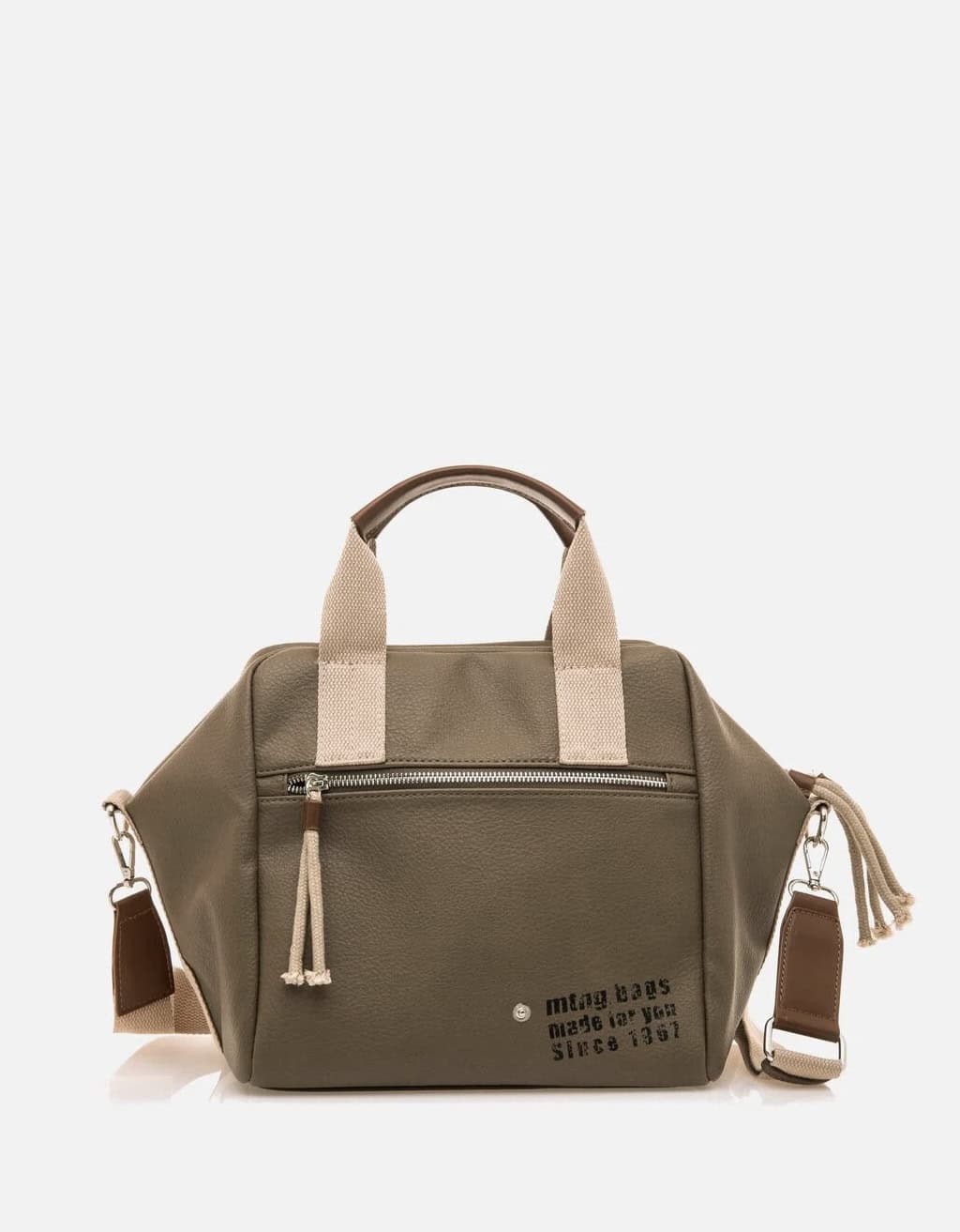 Bolso de mujer de la marca Mustang, modelo Nero. Este bolso casual es perfecto para el uso diario gracias a su espacio amplio y sus diversos bolsillos y compartimentos. Además, tiene dos asas y una correa ajustable y desmontable. Su combinación de color verde con beige hace un contraste que lo diferencia del resto. ¡Complementa tus looks de día a día con Nero de Mustang!