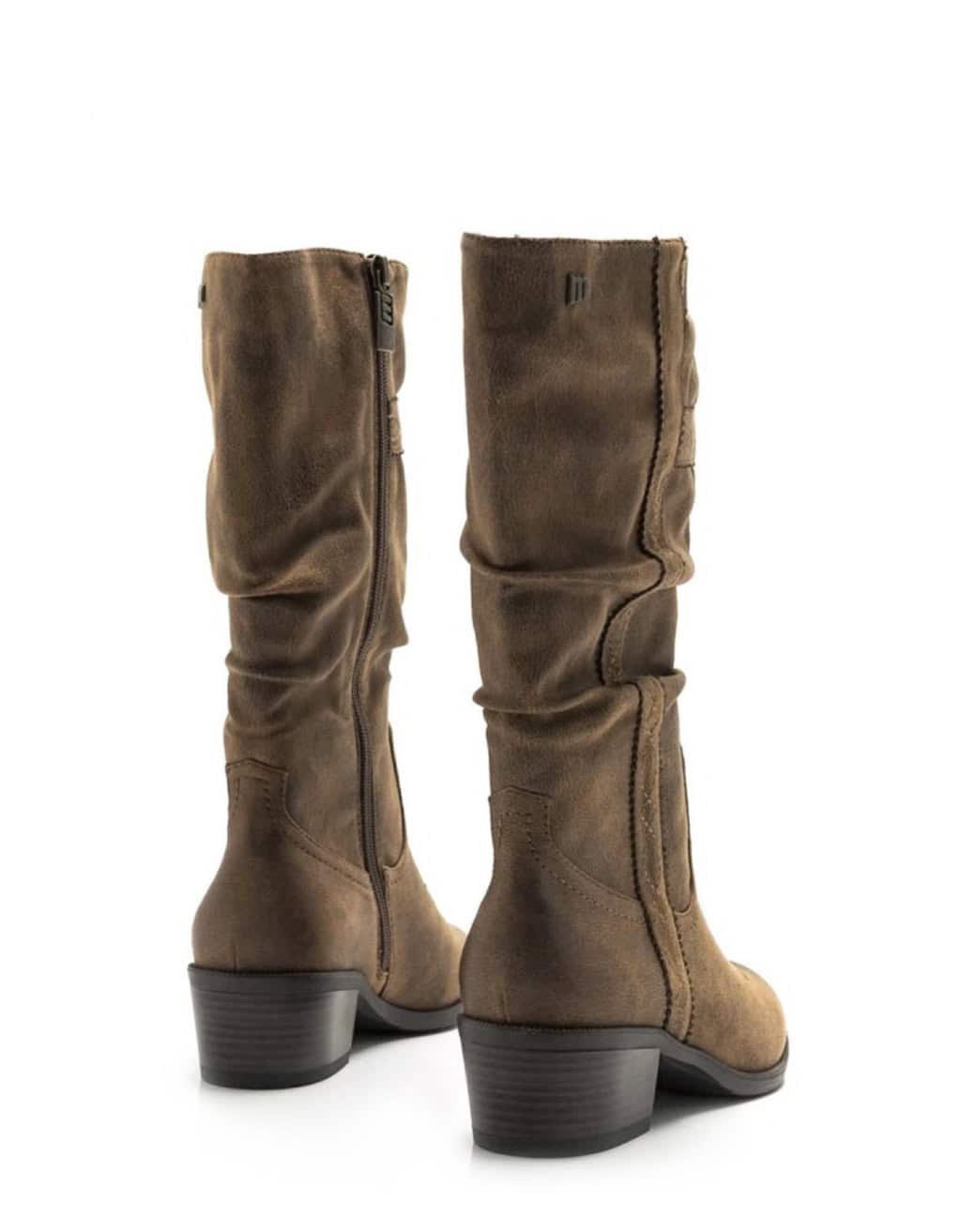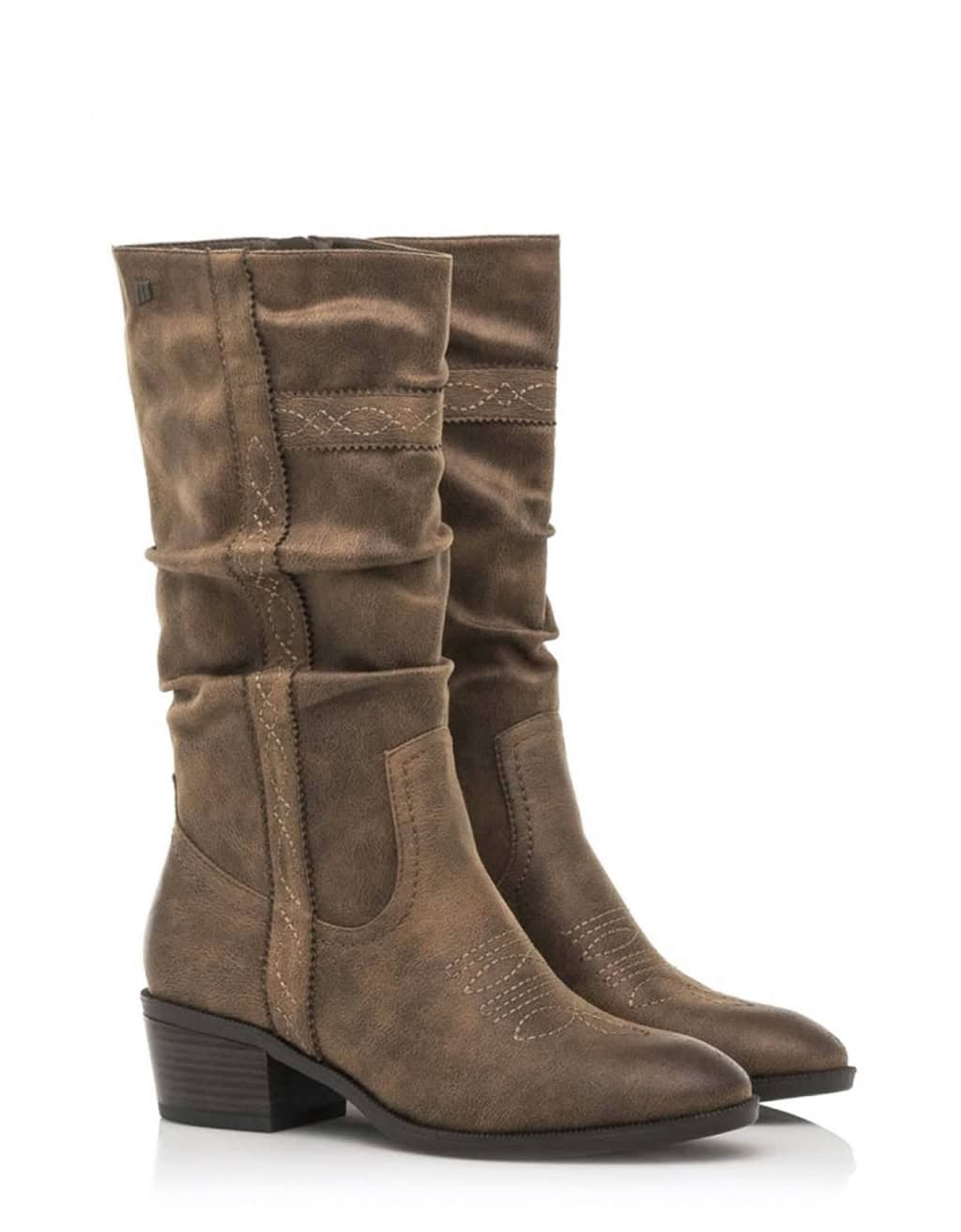 Bota cowboy Miriana High de mujer, de la marca Mustang. Cierre de cremallera lateral. Detalle de dibujos bordados, dando un toque boho. Fabricado en piel sintética, con suela de goma. Tacón ancho de 4 cm. de altura. Color taupe. Modelo cómodo ideal para combinar con tus looks
