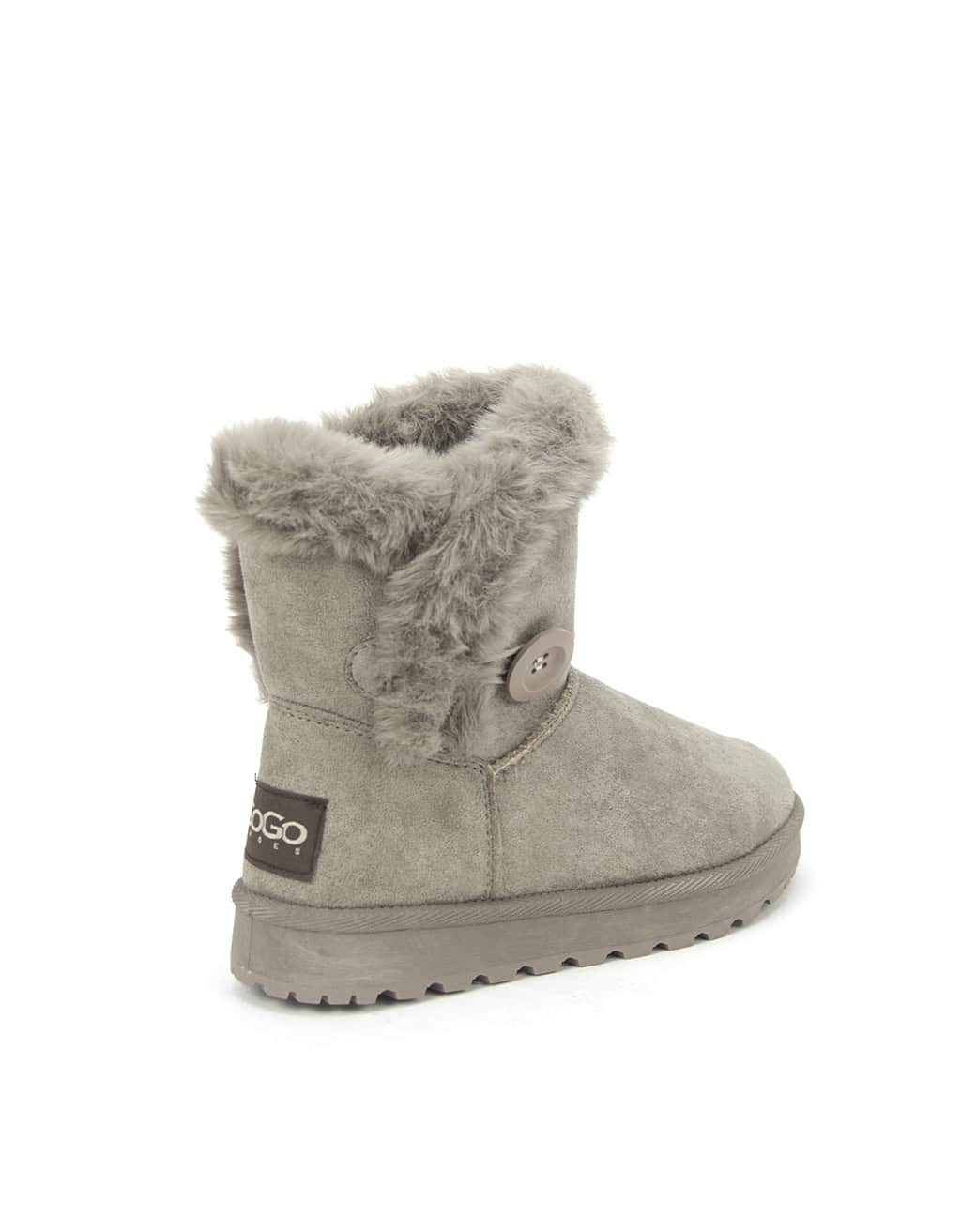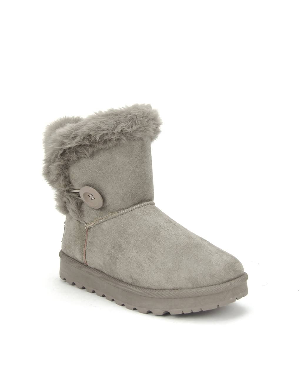 Botin australiana para mujer, realizada en material textil ante con forro de pelo suave y calentito. Con adorno de botón en el lateral exterior.