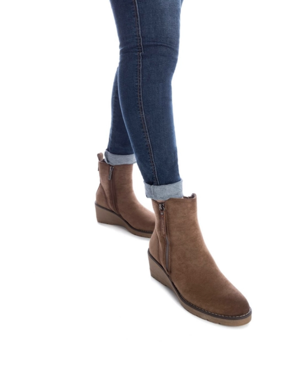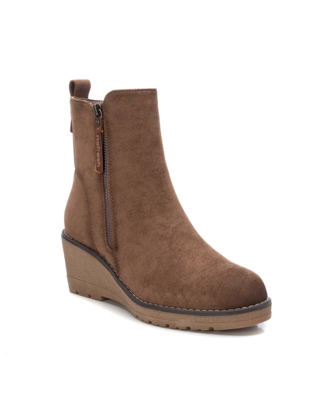 Botin con cuña para mujer de la marca Refresh, modelo 171009. Fabricado en antelina. Cierre mediante cremallera lateral. Tirador trasero para facilitar la puesta. Cremallera lateral decorativa. Cómoda cuña de 6 cm con suela de goma antideslizante. Este modelo ha obtenido el certificado vegano por la organización mundial PETA (Organización de los derechos de los animales).