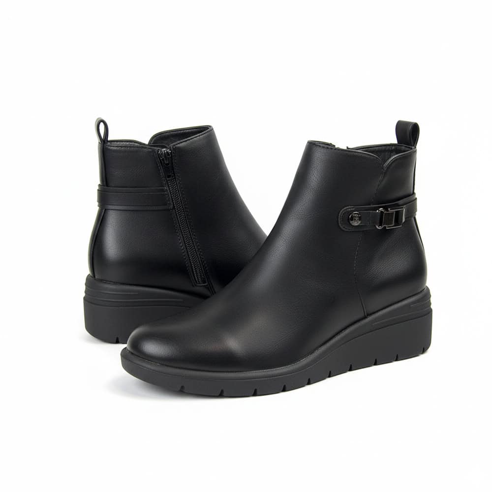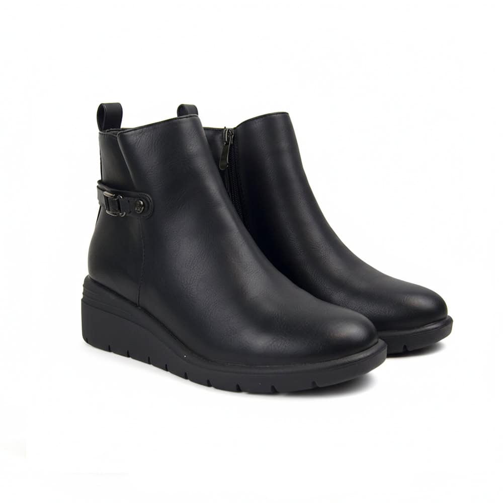 Botín Cuña Mujer Hispaflex 4596 es un calzado diseñado para combinar elegancia y funcionalidad en cada paso. Fabricado en material que imita la piel, incorpora cierre con cremallera lateral y tirador trasero para facilitar su calce. Sus hebillas metálicas decorativas en la correa añaden un toque moderno y sofisticado.