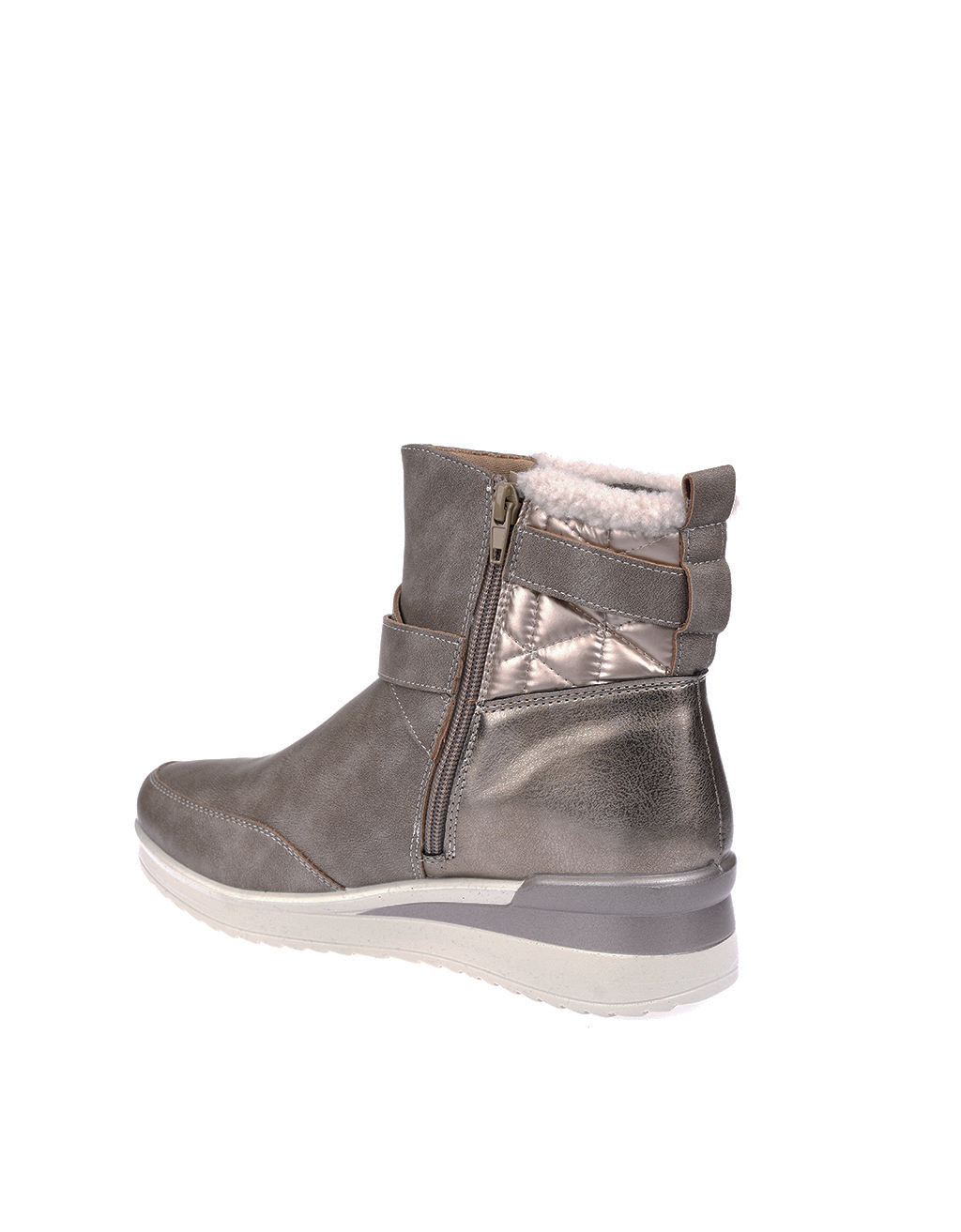 Botin para mujer de la marca Mysoft, modelo 24m575. Fabricado en material que imita la piel en diferentes texturas. Cierre mediante cremallera lateral. Tirador trasero para facilitar la puesta. Correa con hebillas metalizadas decorativas. Cómoda cuña de 5 cm con suela antideslizante.