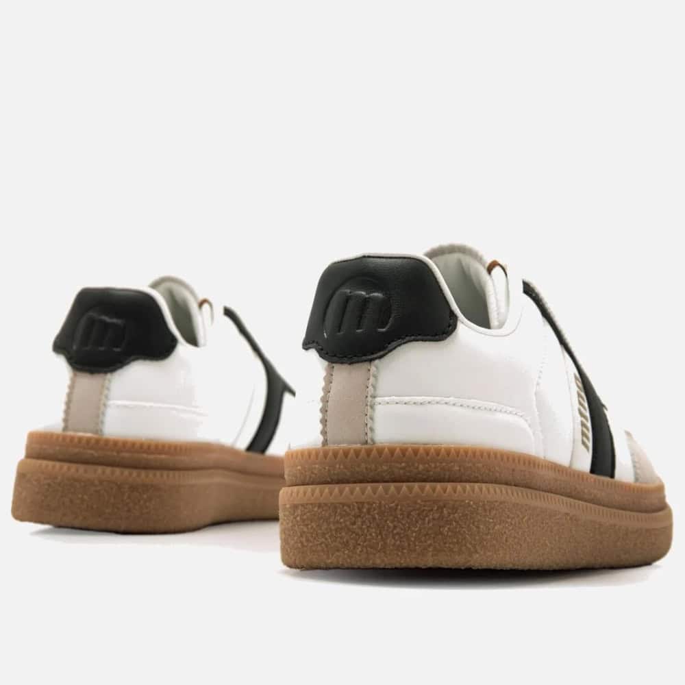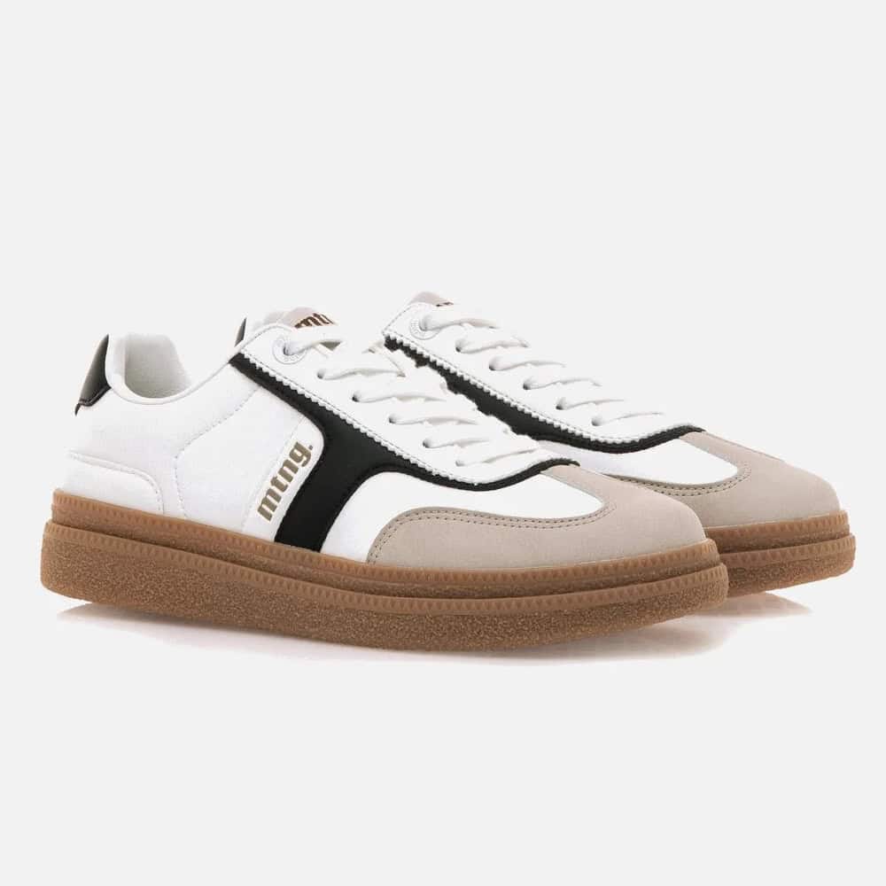 Deportiva de mujer, de la marca Mustang 60461. Inspirada en la clásica bamba de color blanco, cierre de cordones planos al tono. Tiene detalles de color negro en el lateral de la zapatilla junto su trasera, iniciales de la marca en color dorado en lengüeta y lateral de la zapatilla. Plataforma de doble capa que te regala unos centímetros de altura, con suela de color caramelo. Un modelo de tendencia que no puede faltar en tu armario.