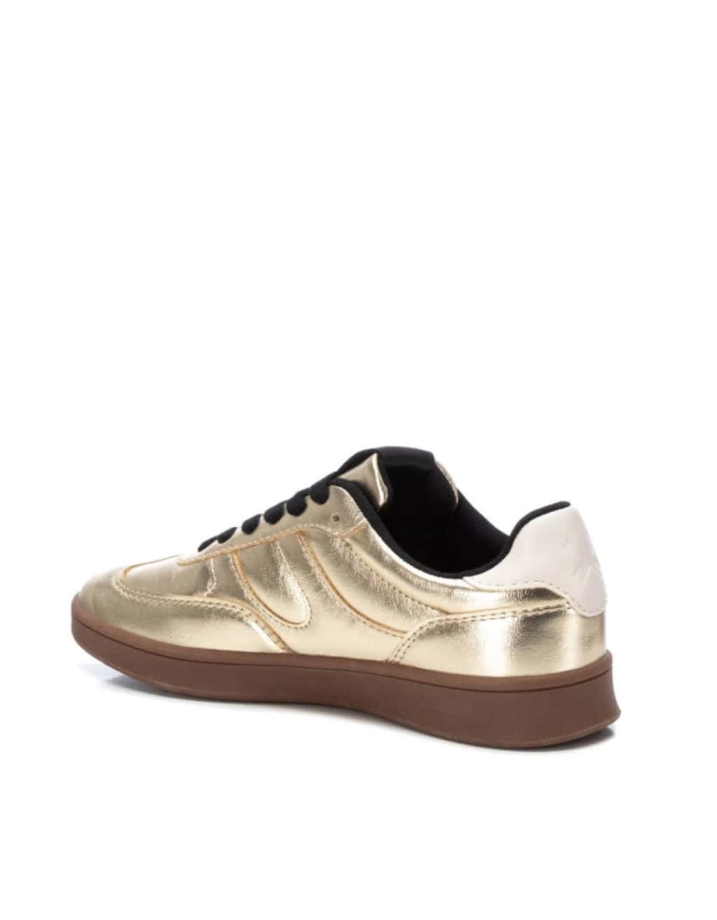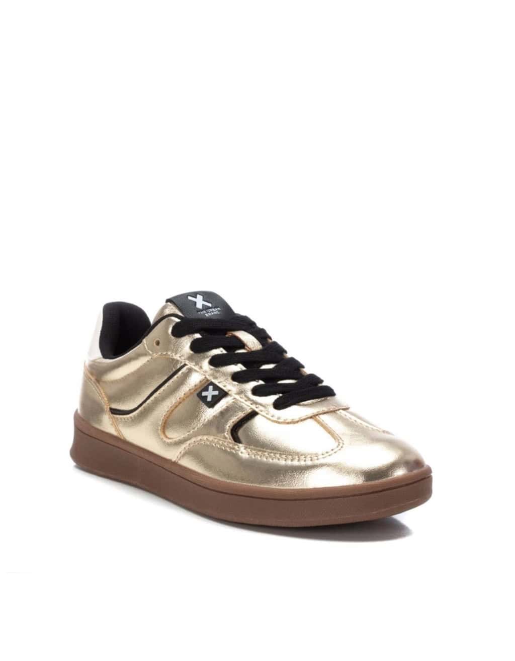 Deportiva de mujer de la marca Xti, modelo 143384. Fabricada en material que imita la piel. Metalizado. Cierre cordonera. Suela de goma antideslizante. Con plantilla extraíble. Este modelo ha obtenido el certificado vegano por la organización mundial PETA (Organización de los derechos de los animales).