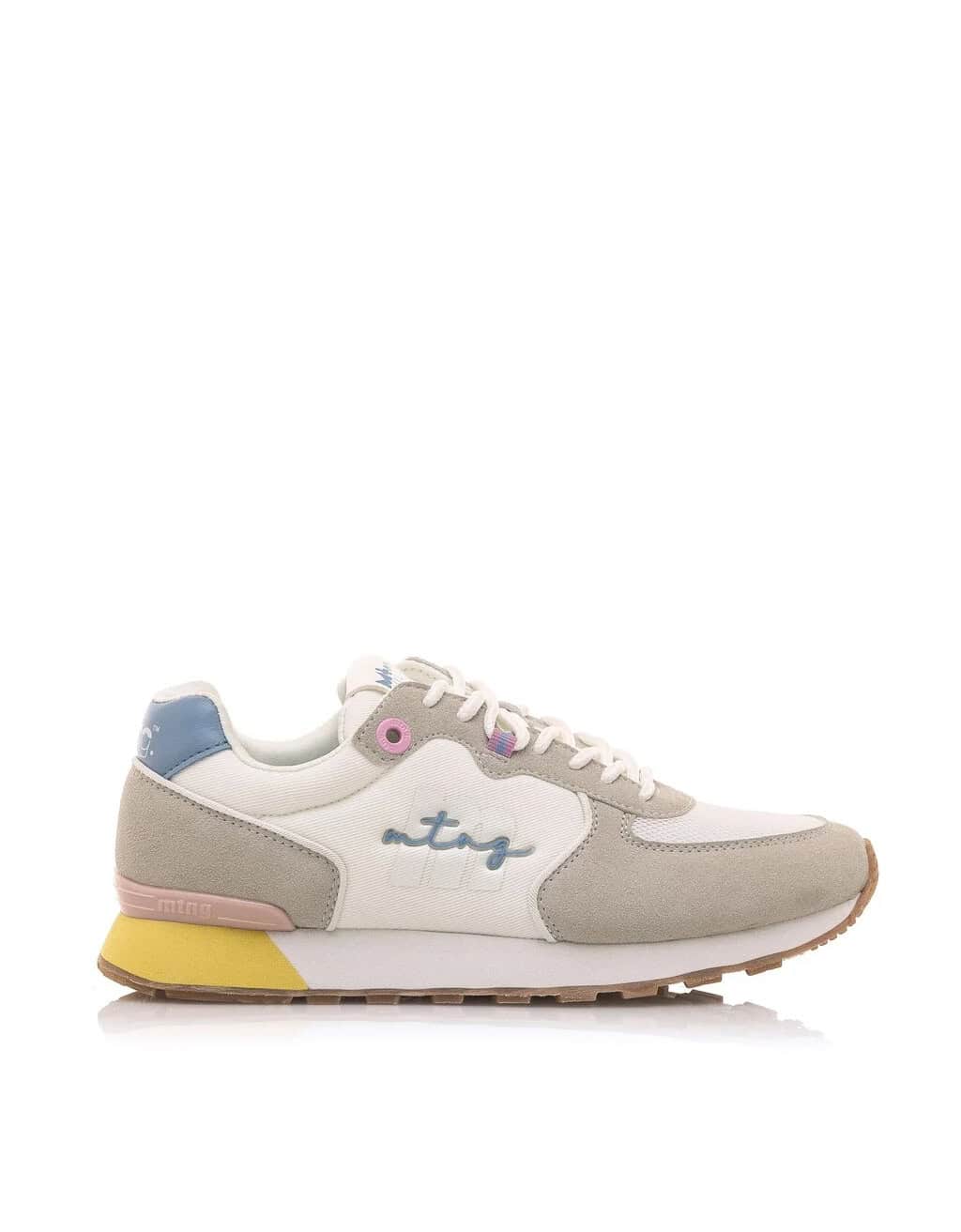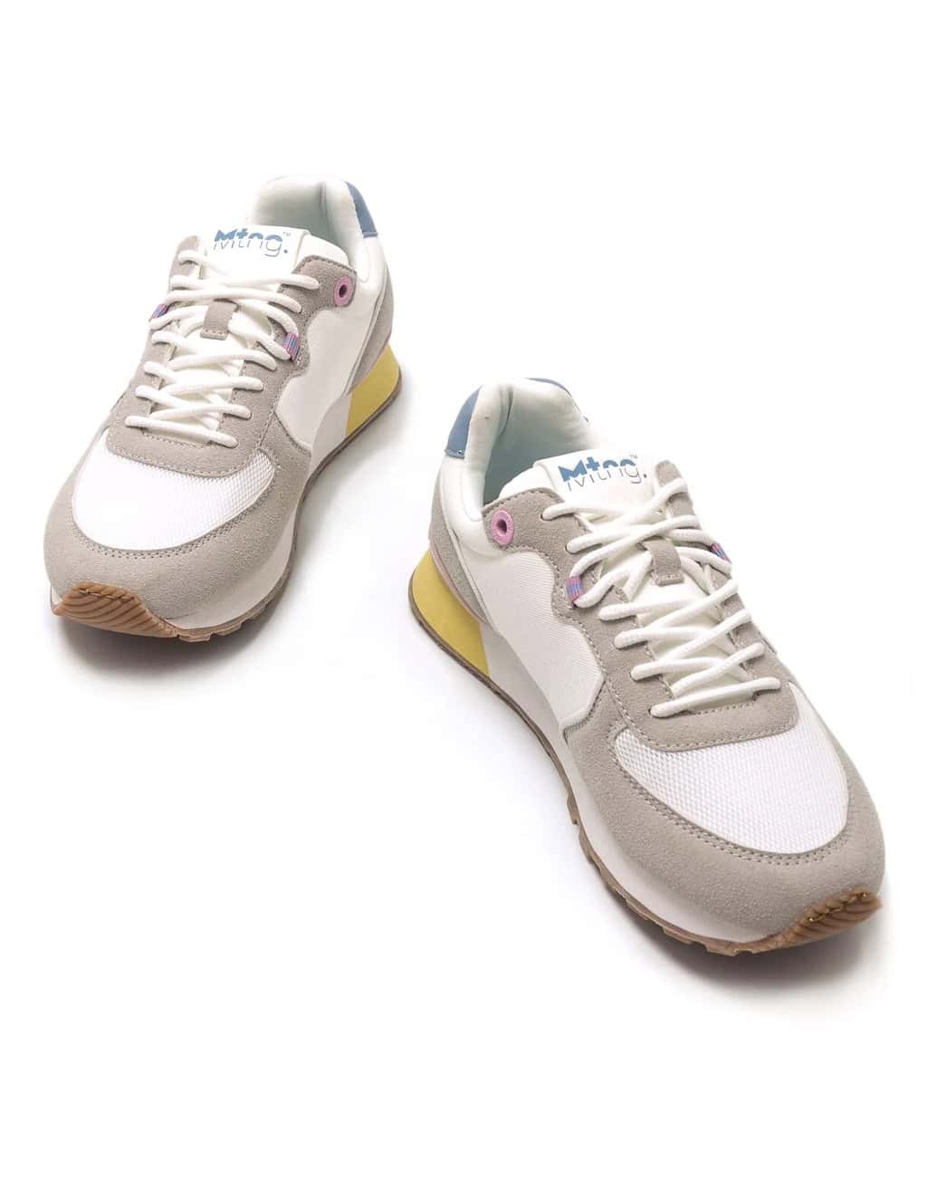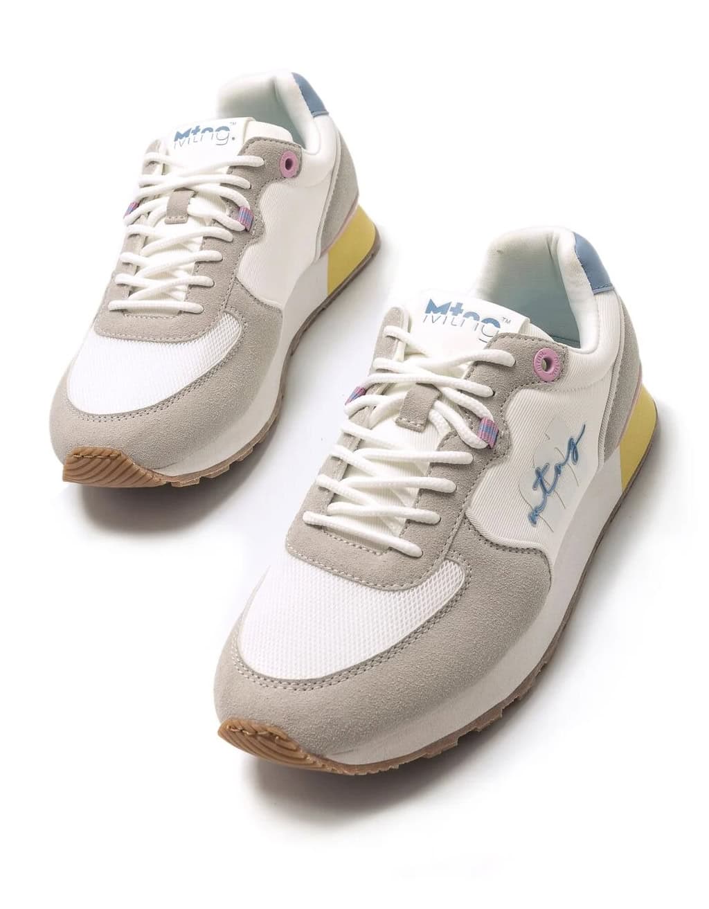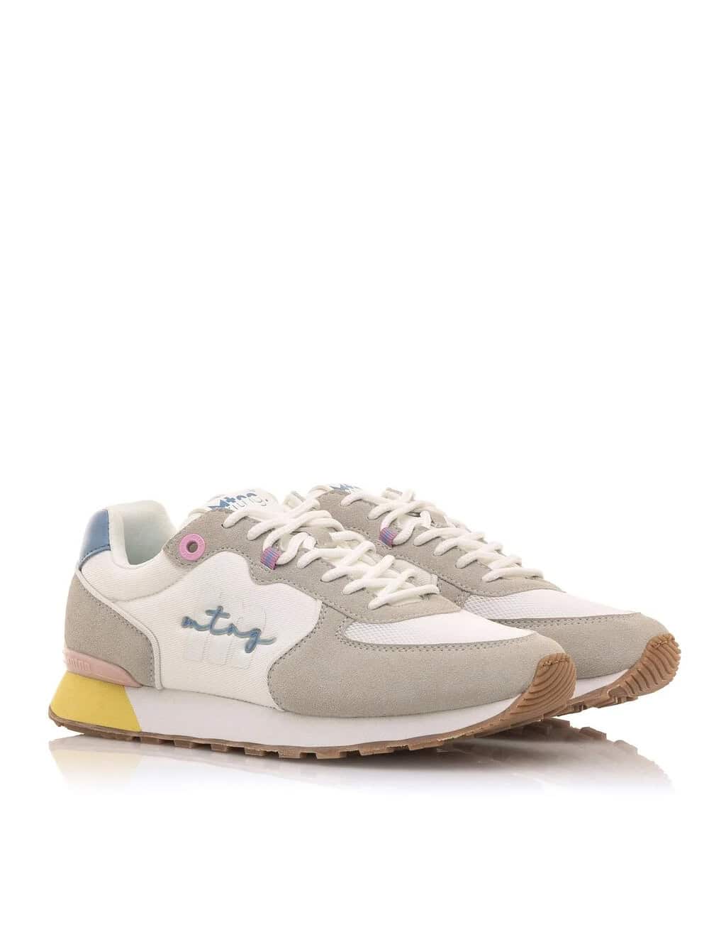 Deportivo Joggo Mustang para mujer, fabricada en piel sintética de color blanco. Su diseño atemporal incorpora paneles en diferentes texturas, color amarillo, rosa y azul en tonalidades pastel. Cierre de cordones tubulares blancos. Incorpora el logo en relieve y la firma de la marca en el lateral. Nombre de la marca en el cuello y la lengüeta. Un básico para tus looks deportivos que no puede faltar en tu armario.