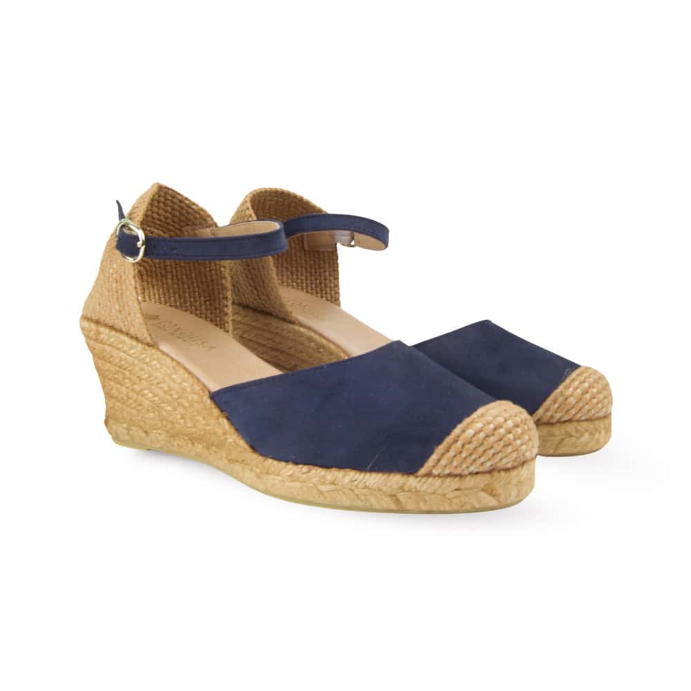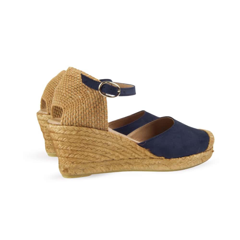Alpargata de mujer en color Marino con cuña de esparto es una opción elegante y cómoda para los meses de primavera y verano. Este modelo destaca por su diseño de punta cerrada, fabricada en una suave antelina y pulsera ajustable al tobillo, que aporta una sujeción segura.