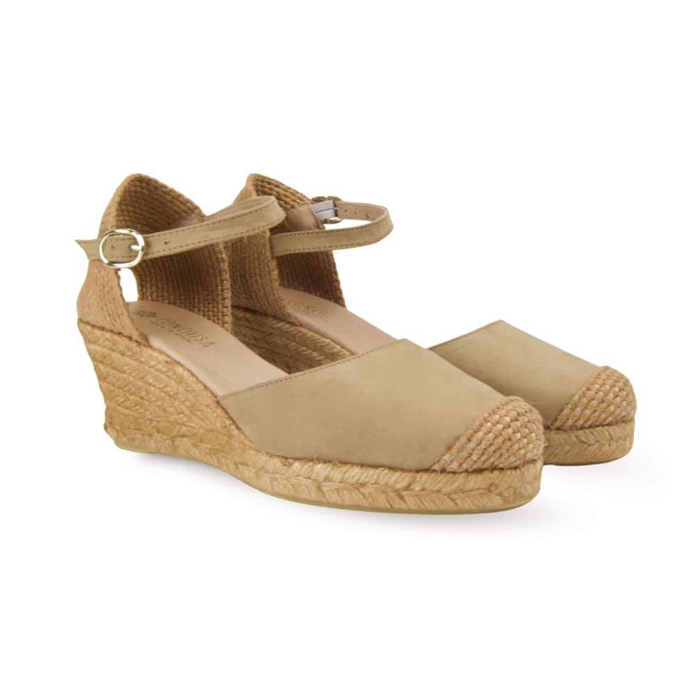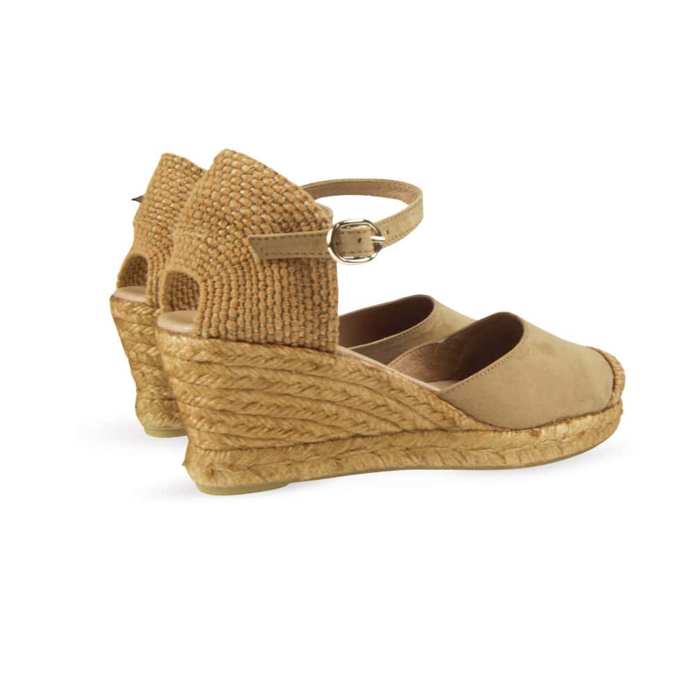 Alpargata de mujer en color Barro con cuña de esparto es una opción elegante y cómoda para los meses de primavera y verano. Este modelo destaca por su diseño de punta cerrada, fabricada en una suave antelina y pulsera ajustable al tobillo, que aporta una sujeción segura.