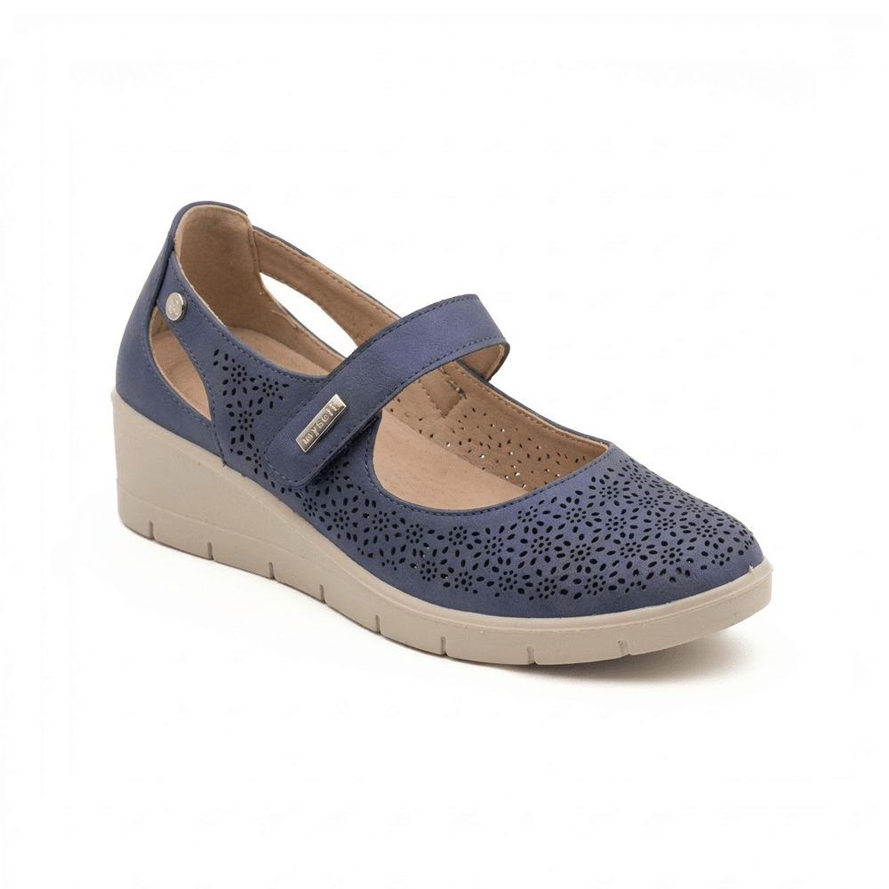 Las merceditas mujer cuña marino Mysoft 25M208 combinan comodidad y estilo con diseño calado y plantilla SoftGel.