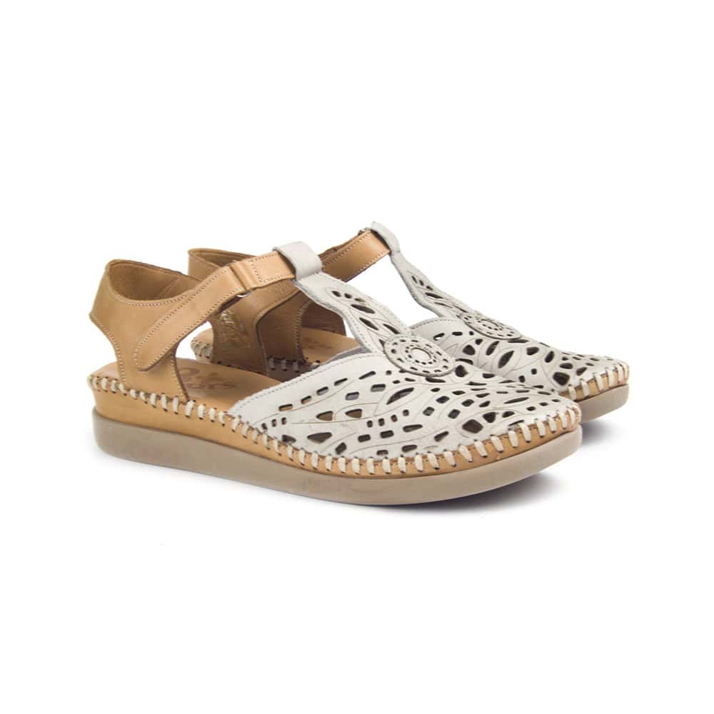 Sandalia Cerrada Mujer 48Horas 514102 combina la comodidad que necesitas con el estilo que te gusta. Con puntera cerrada y una ligera cuña de 4,5 cm, este modelo está fabricado en piel de primerísima calidad, ofreciendo una sensación de suavidad y frescura gracias a sus detalles calados. La pulsera con cierre de velcro permite un ajuste perfecto al pie, mientras que la suela cosida al corte con pespunte visto refuerza su resistencia y aporta ese toque artesanal que tanto valoramos.