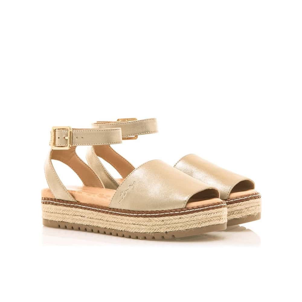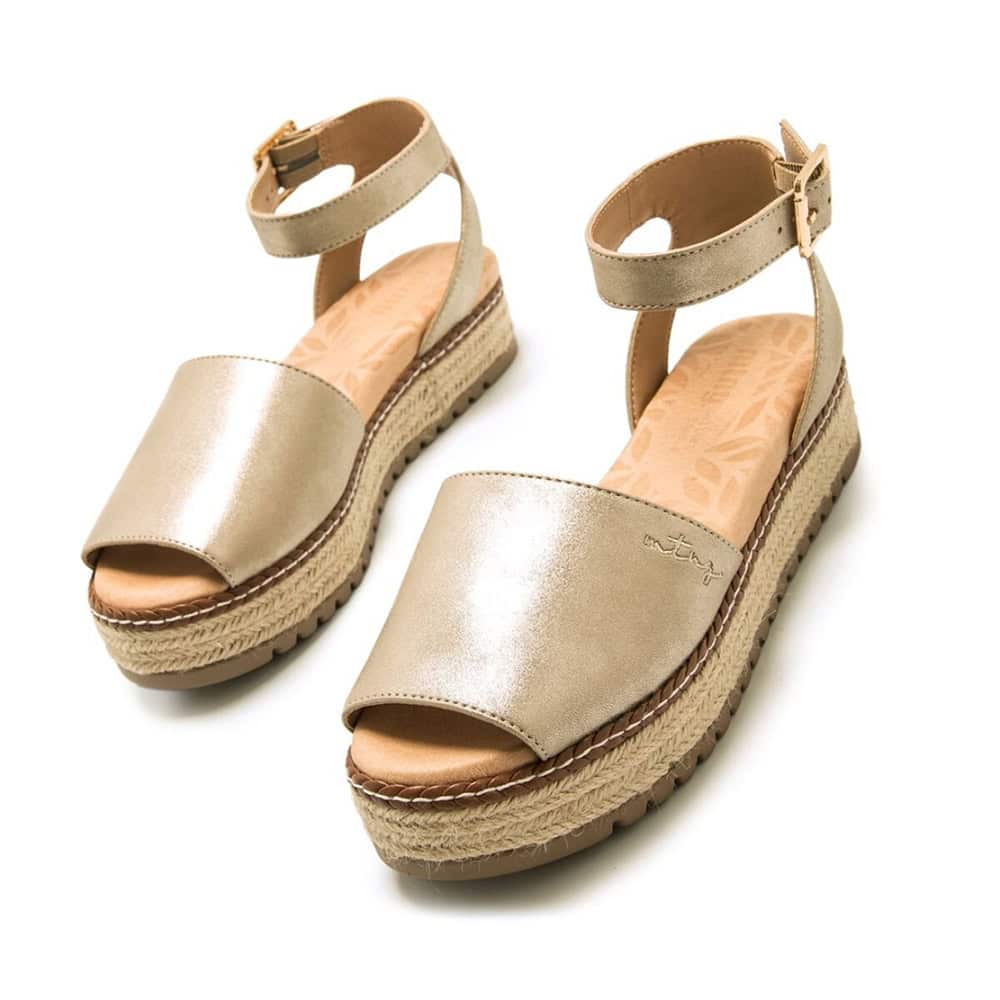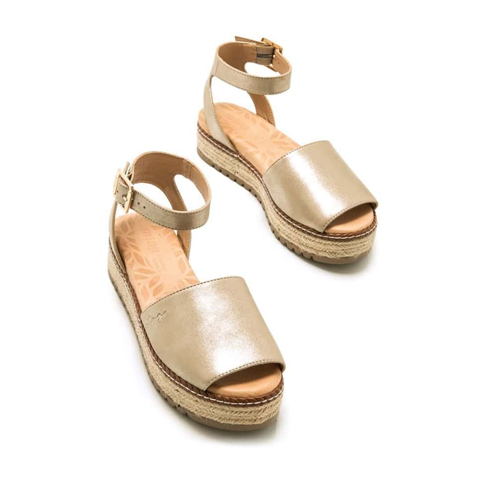 Sandalia Plana Mujer Mustang 59617, de la colección Amelie, es una sandalia que combina lo mejor del diseño actual con un toque clásico y femenino. Su acabado dorado brillante le da un aire sofisticado y fresco, mientras que las tiras trenzadas en la parte delantera aportan textura y estilo. La plataforma forrada en yute suma un contraste natural que la convierte en una sandalia ideal para todo tipo de ocasiones veraniegas. Sujeta al tobillo con una pulsera con hebilla, ofrece seguridad y comodidad a partes iguales.