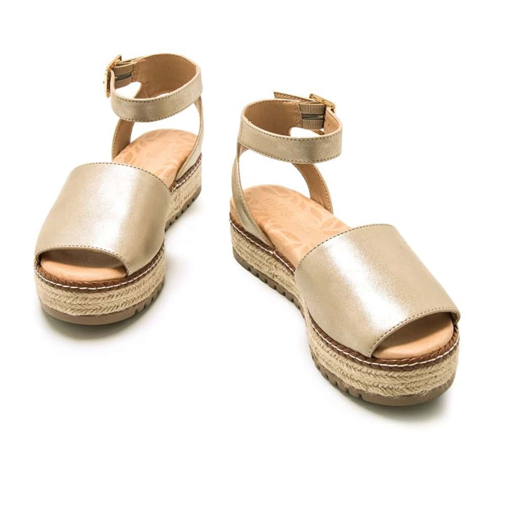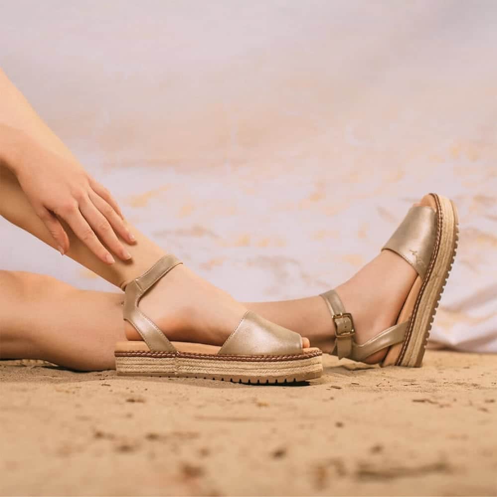 La Sandalia Plana Mujer Mustang 59617, de la colección Amelie, es una sandalia que combina lo mejor del diseño actual con un toque clásico y femenino. Su acabado dorado brillante le da un aire sofisticado y fresco, mientras que las tiras trenzadas en la parte delantera aportan textura y estilo. La plataforma forrada en yute suma un contraste natural que la convierte en una sandalia ideal para todo tipo de ocasiones veraniegas. Sujeta al tobillo con una pulsera con hebilla, ofrece seguridad y comodidad a partes iguales.