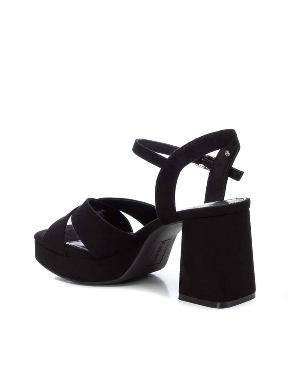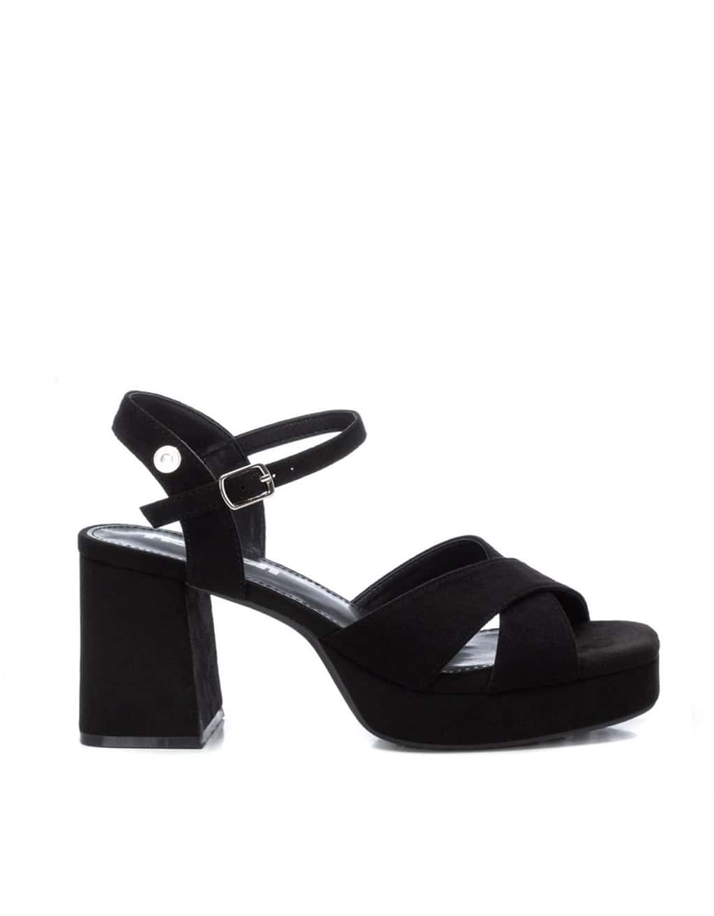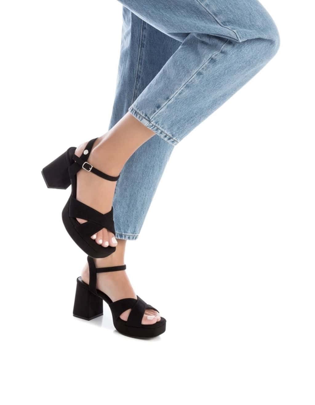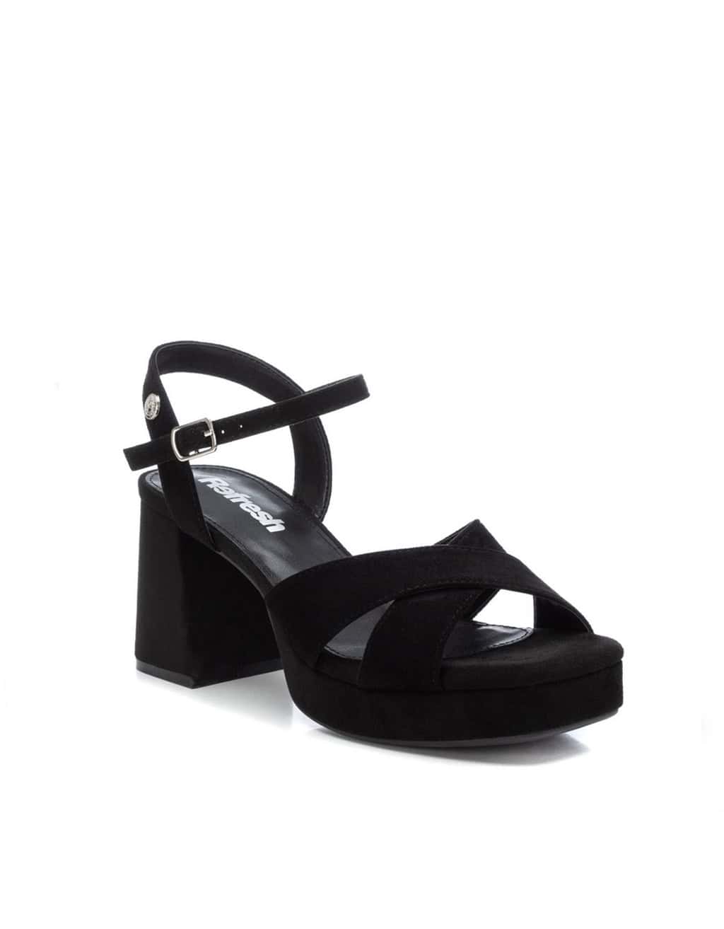 Sandalia de tacon para mujer, de la marca Refresh. Fabricada en suave antelina. Modelo de pala cruzada y pulsera al tobillo con hebilla ajustable. Cómoda planta acolchada. Tacón ancho de 8 cm y plataforma delantera forrado en el mismo material. Suela antideslizante. Este modelo ha obtenido el certificado vegano por la organización mundial PETA (Organización de los derechos de los animales)