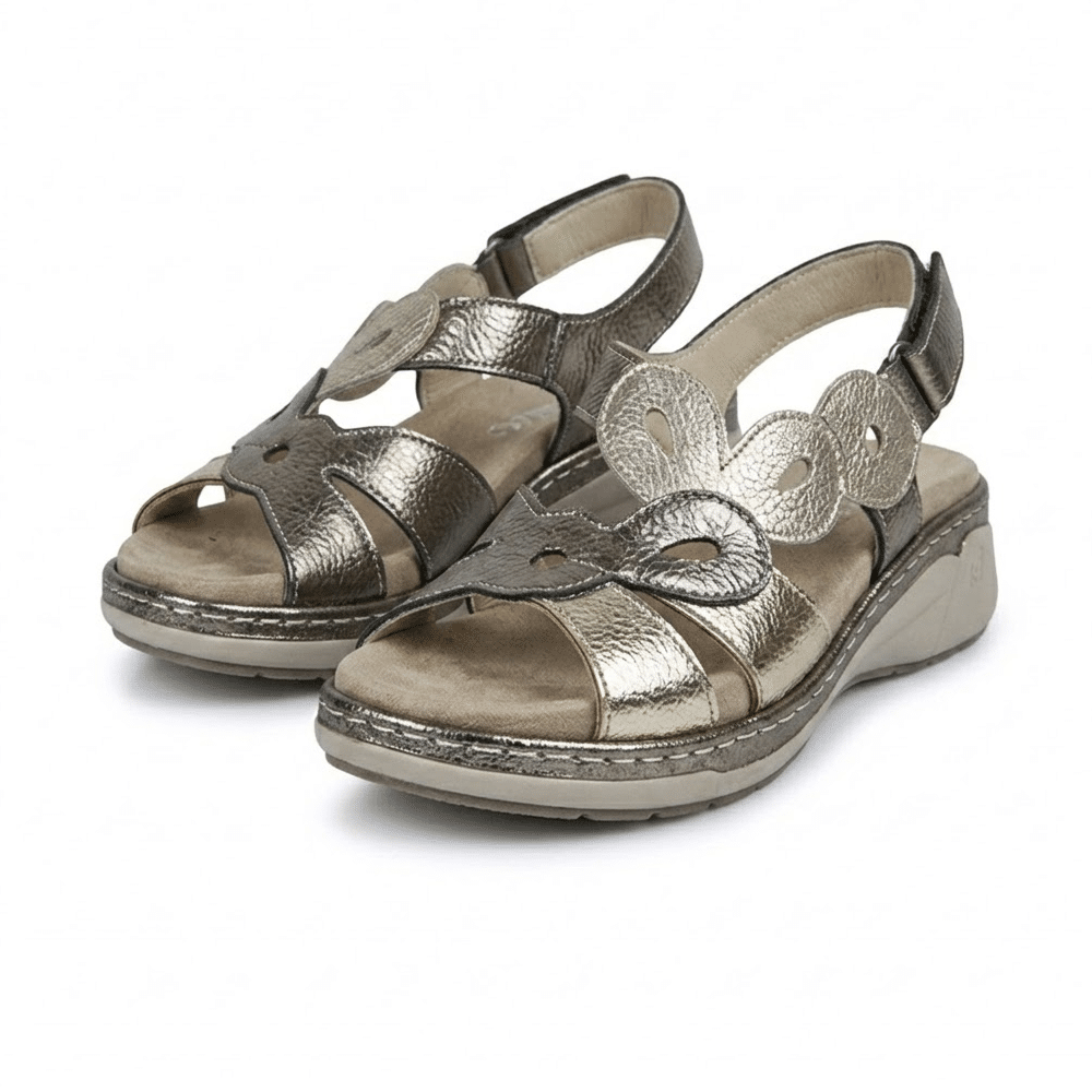- Marian Aztec: tiras + velcro talón, tricolor oro/cava/plata, piel vegana. La opción vegana.