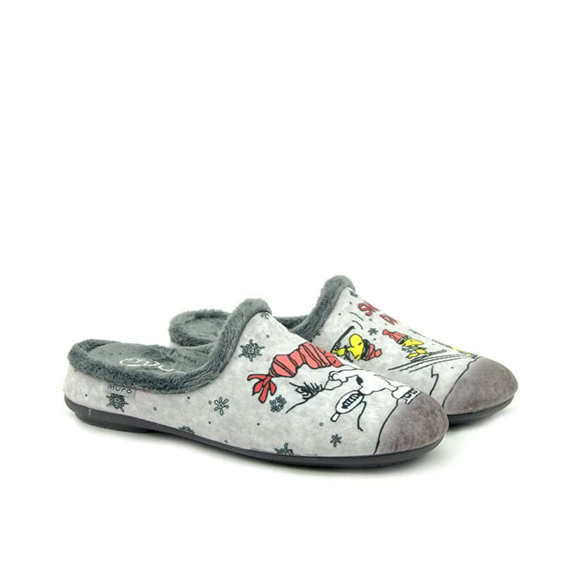 Zapatilla de casa de mujer “Snoopy” de la marca Muro, referencia 4118. Fabricada en un suave tejido invernal. Forro interior muy suave y cálido con plantilla extraíble. Son flexibles, ligeras y fáciles de calzar. Suela antideslizante. Fabricado en España por la marca Muro.
