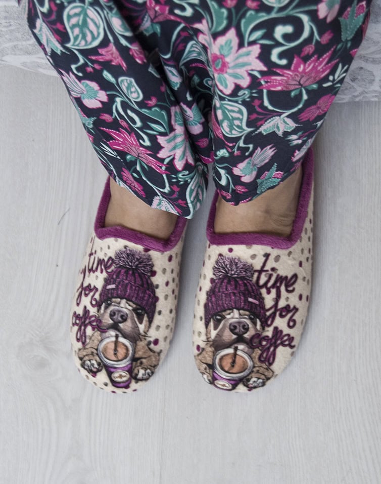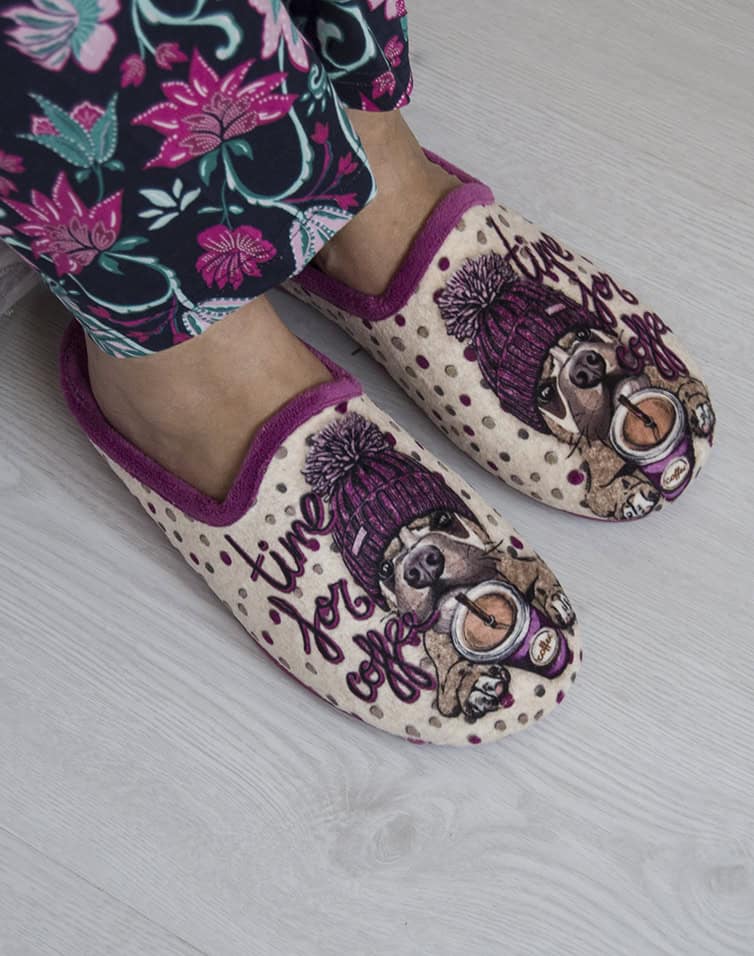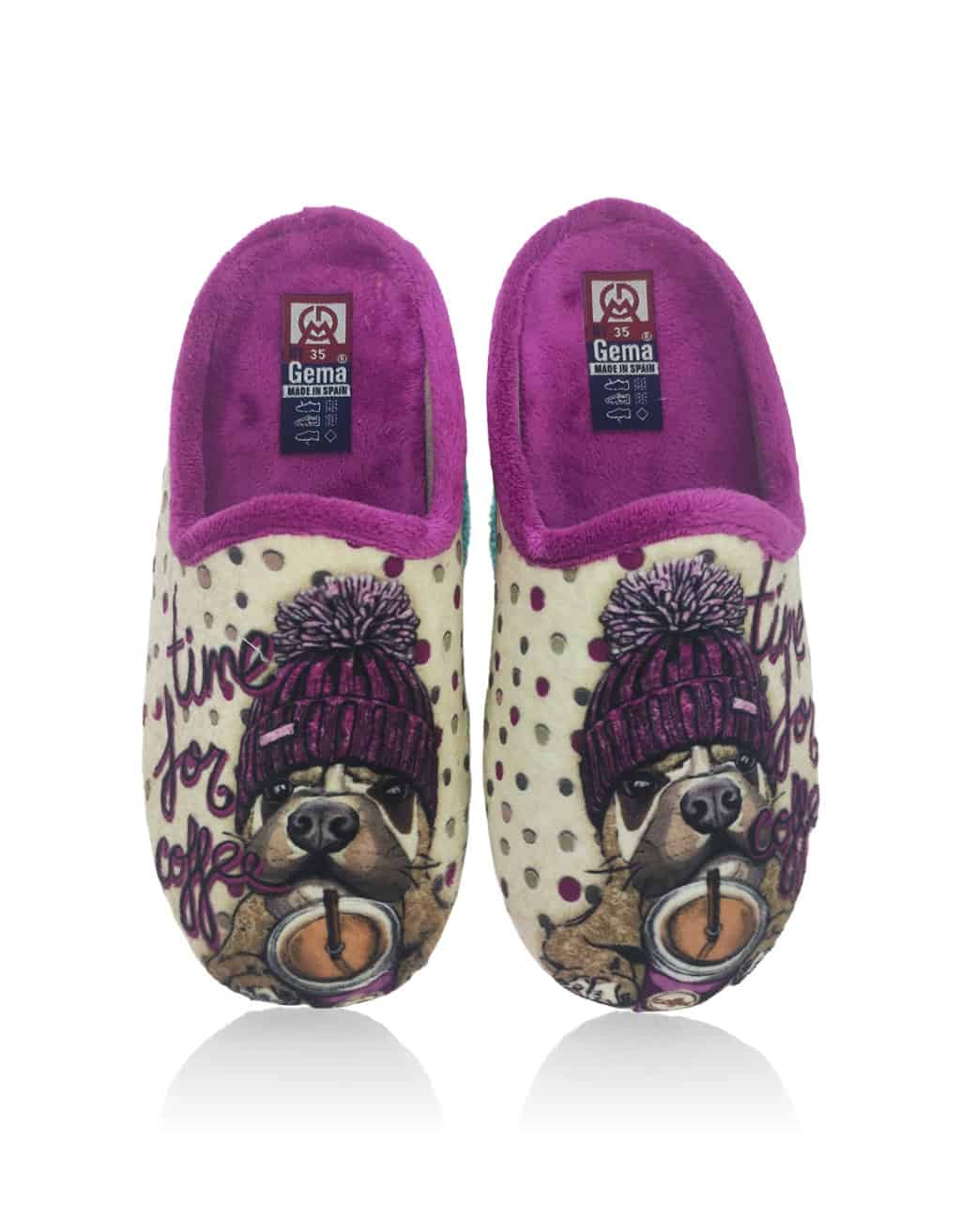 Zapatilla de andar por casa para mujer, realizada en un suave tejido invernal y plantilla extraíble. Suela de goma flexible y antideslizante. Fabricada en España por la marca Gema Garcia.