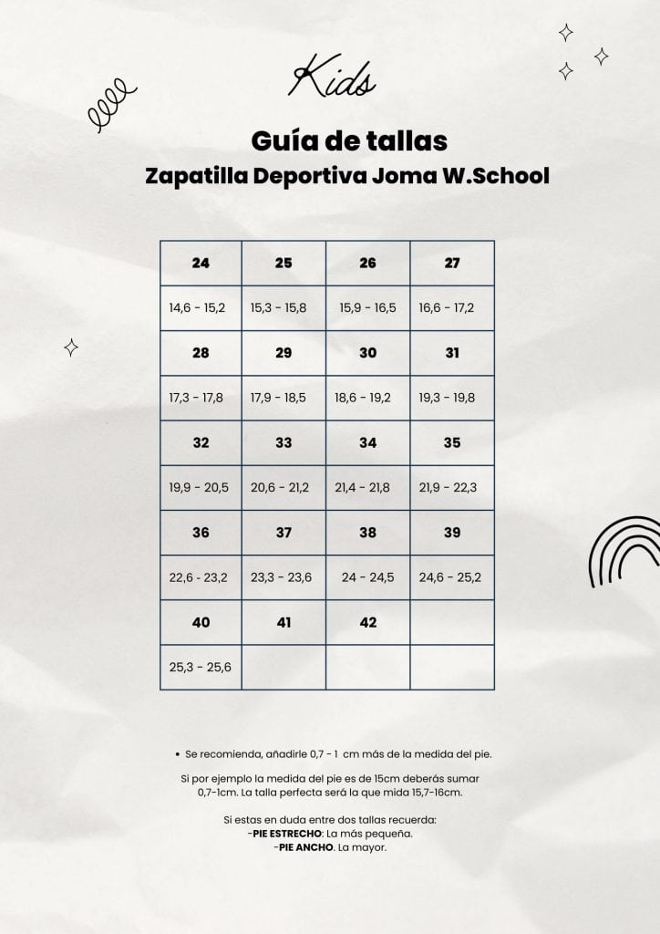 Zapatilla deportiva de la marca Joma, W.School 2433. Zapatillas deportivas de niño/niña con modelo pensado para el uso cotidiano. Están reforzadas para que resistan a cualquier tipo de juego. Su durabilidad está garantizada gracias al material resistente. Se quitan y se ponen con facilidad con cierre adherente. Ideales para uniforme escolar. Plantilla de piel y puntera reforzada.