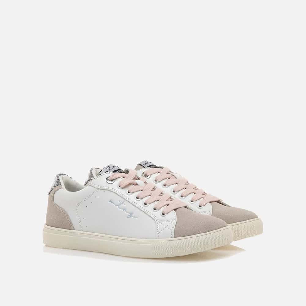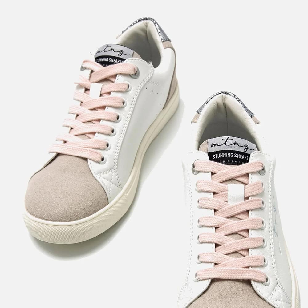 Zapatillas deportiva de mujer marca Mustang, 60712 Susan. Estas zapatillas combinan detalles en beige arena y azul con un toque metálico en el talón, lo que les aporta un estilo distintivo. Los cordones en color rosa claro añaden un contraste, haciendo el calzado versátil y fácil de combinar con diversidad de colores. Enamórate de Susan de Mustang.