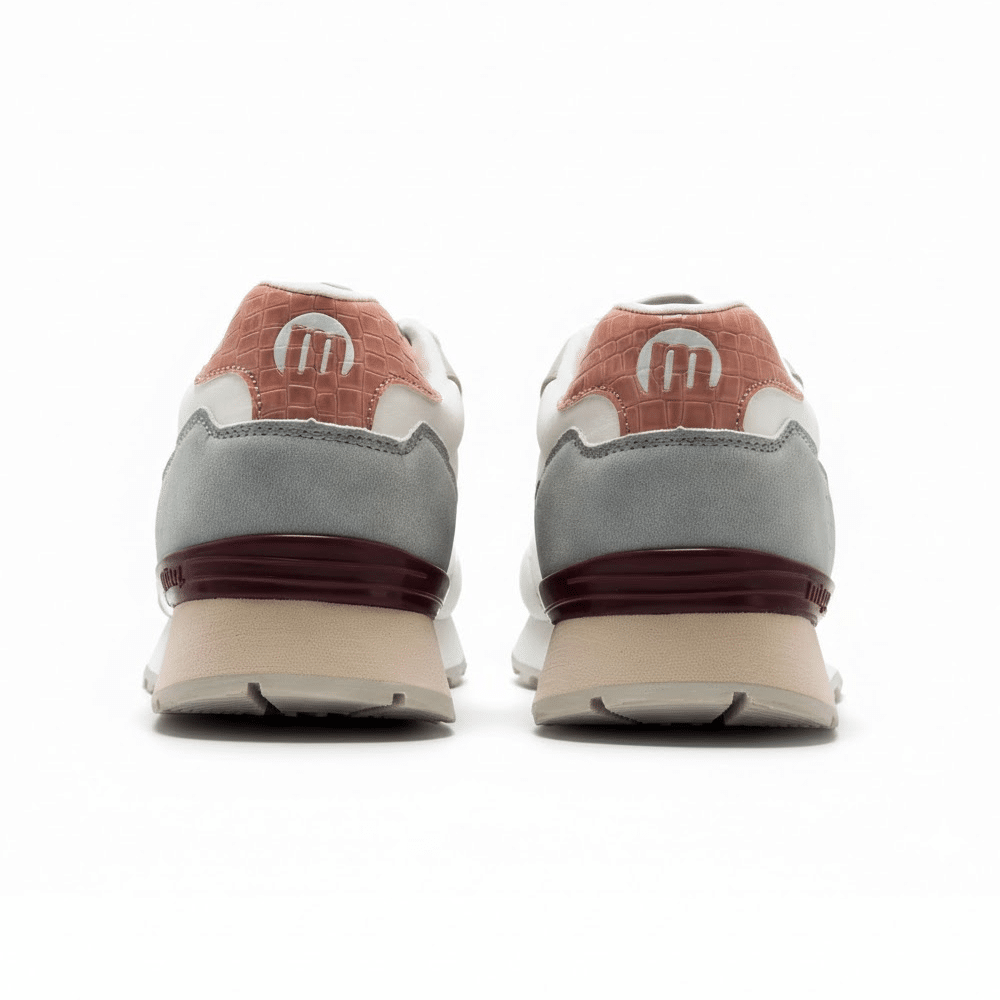 Inspiradas en el running clásico, estas sneakers mantienen una estética vintage actualizada. El talón efecto coco en tono coral aporta contraste, mientras que las piezas en azul y gris equilibran el diseño. El logo Mustang bordado en el lateral refuerza su identidad deportiva.