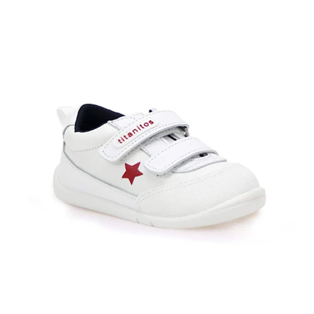Zapatillas respetuosas para niño de la marca Titanitos, modelo B500 Leo. Cuenta con cierre de doble velcro, lo que facilita su ajuste y permite a los niños calzarse fácilmente sin ayuda. Además, su suela antideslizante proporciona estabilidad y seguridad al caminar o correr.