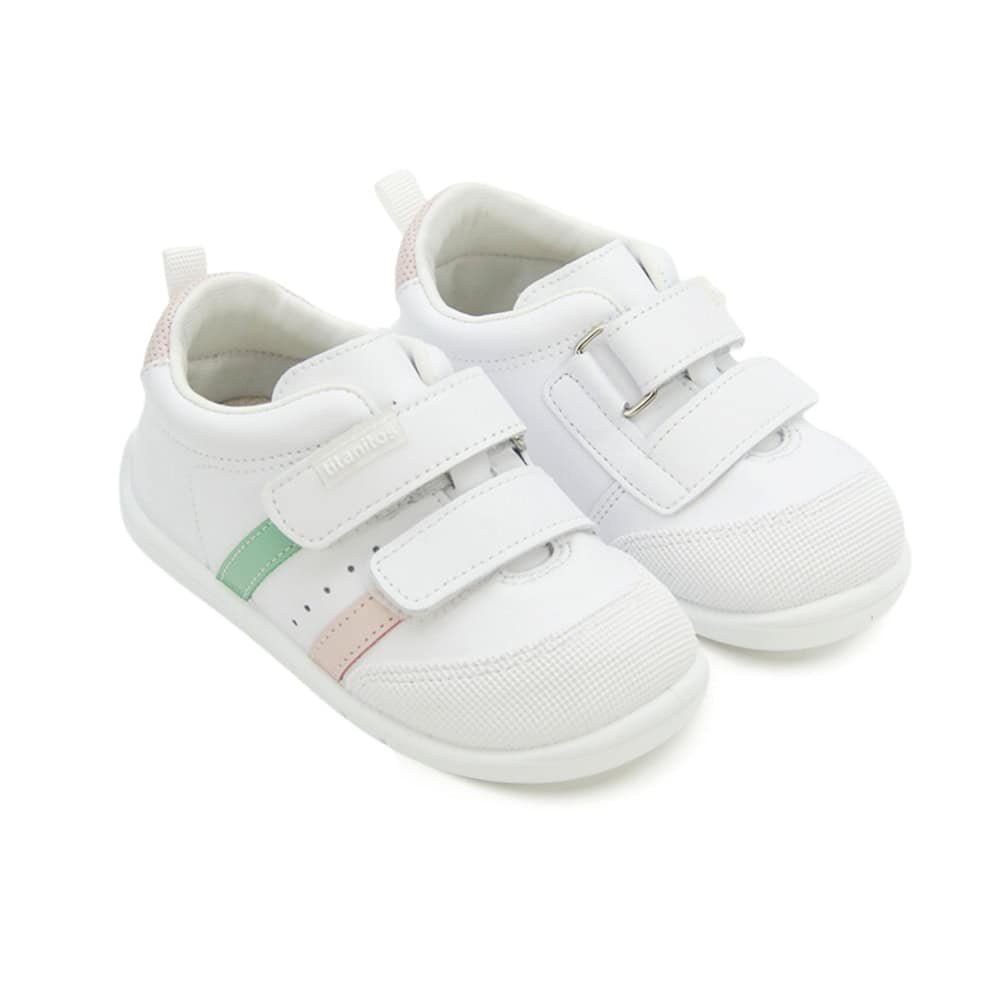 Zapatillas respetuosas para niña, de la marca Titanitos, modelo B500 Amancio. Cuenta con cierre de doble velcro, lo que facilita su ajuste y permite a los niños calzarse fácilmente sin ayuda. Además, su suela antideslizante proporciona estabilidad y seguridad al caminar o correr.