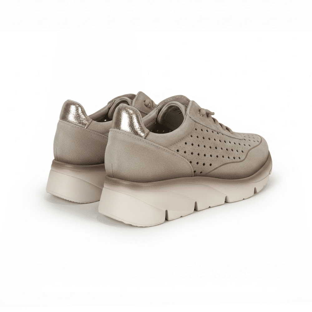 Zapato cómodo de mujer Khloe 850 taupe fabricado en piel de alta calidad, con cordones elásticos para un ajuste fácil y plantilla acolchada extraíble que aporta suavidad en cada paso. Su suela dentada antideslizante garantiza estabilidad y seguridad, convirtiéndolo en un modelo urbano y versátil perfecto para el uso diario.