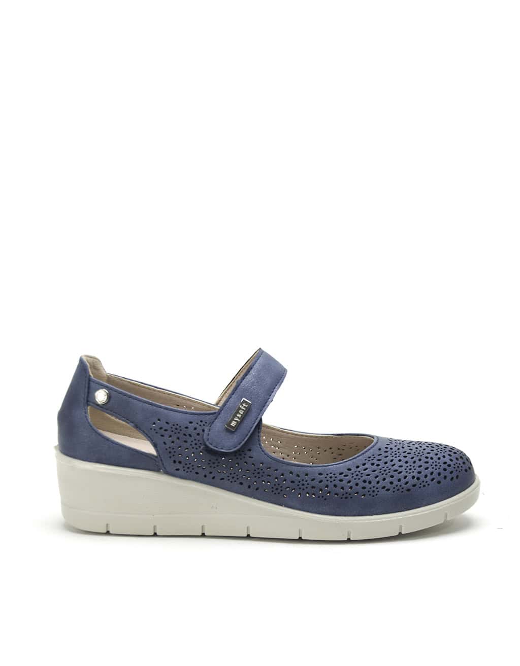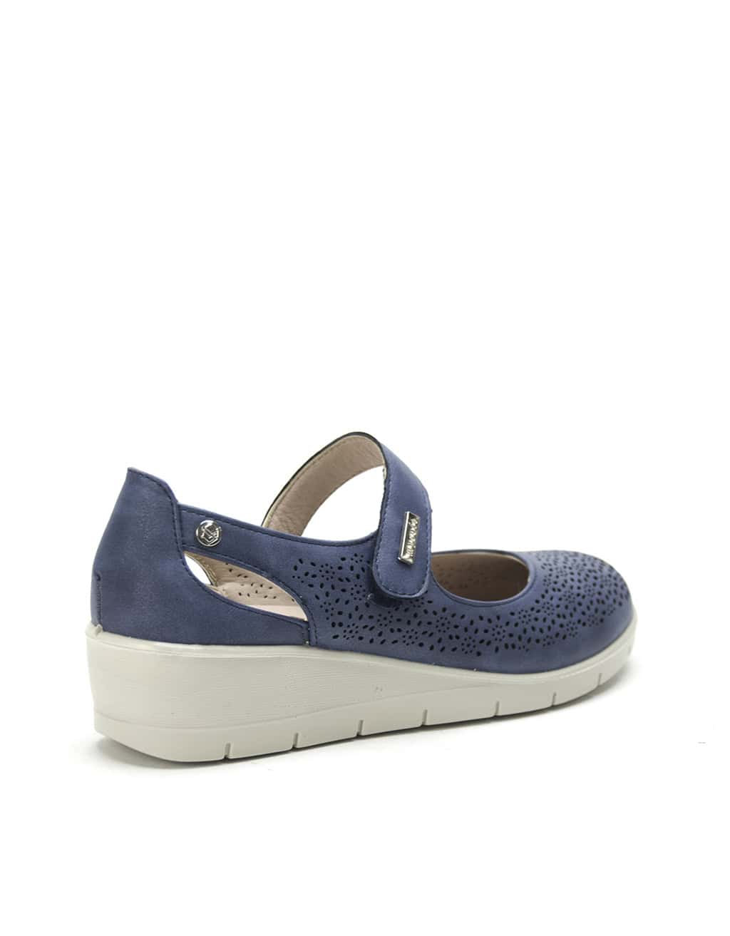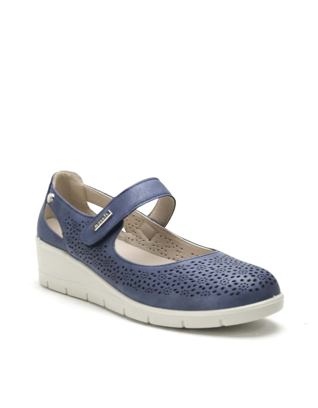 Zapato estilo mercedita con cuña de mujer, de la marca Mysoft. Fabricada en material que imita la piel con diseño de calados. Cómoda plantilla acolchada y extraíble para mayor comodidad. Cierre de velcro para mayor ajuste. Altura de la cuña 4 cm.