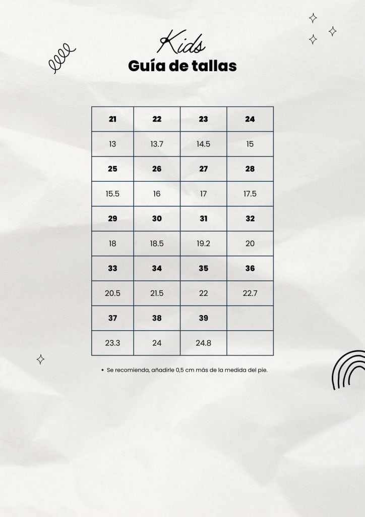 | Talla | 21, 22, 23, 24, 25, 26, 27, 28, 29, 30, 31, 32, 33, 34, 35, 36, 37, 38, 39 |