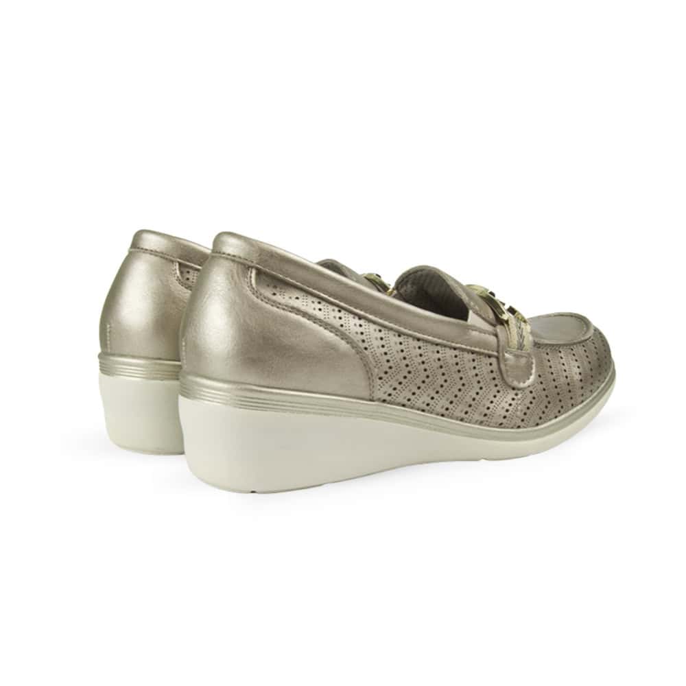 Zapato estilo mocasín con cuña de mujer de la marca Flexpies, modelo 201. Fabricado en piel de alta calidad. Diseño calado decorativo ideal para esta temporada. Plantilla extraíble, que garantizan la comodidad desde la primera puesta además de amortiguar y suavizar los impactos.