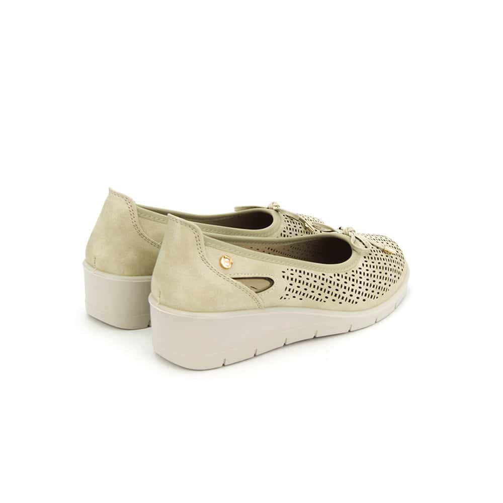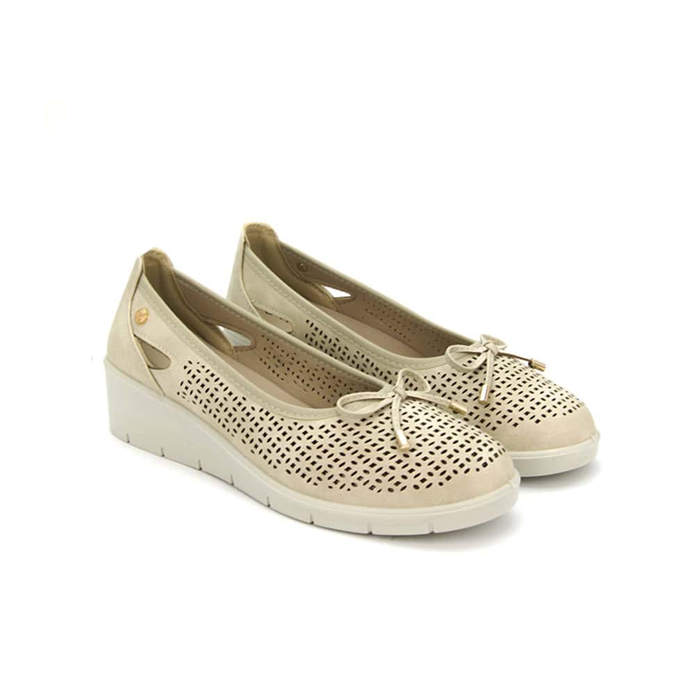 Zapato estilo bailarina o salón con cuña de mujer de la marca Mysoft, modelo 24M209. Fabricada en material que imita la piel con diseño de calados. Plantilla extraíble de “SoftGel”, con nanopartículas de coloide que garantizan la comodidad desde la primera puesta además del memory foam para amortiguar y suavizar los impactos. Altura de la cuña 4 cm.