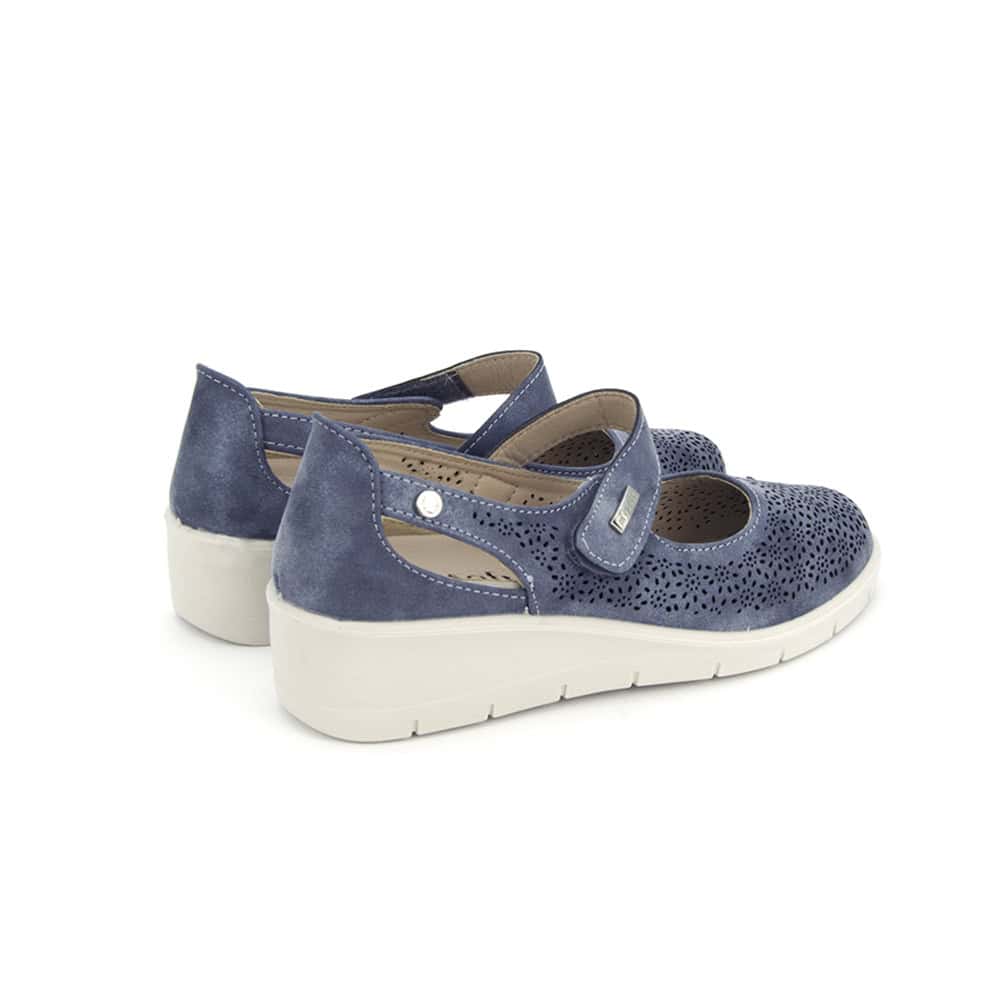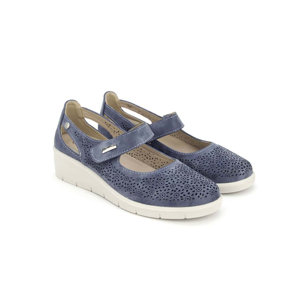 Zapato estilo mercedita con cuña de mujer de la marca Mysoft, modelo 25M208. Fabricada en material que imita la piel con diseño de calados. Plantilla extraíble de “SoftGel”, con nanopartículas de coloide que garantizan la comodidad desde la primera puesta además del memory foam para amortiguar y suavizar los impactos. Cierre de velcro para mayor ajuste. Altura de la cuña 4 cm.