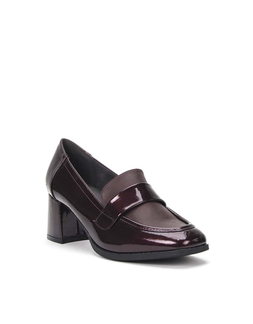 Zapato mocasin para mujer, de la marca MySoft. Fabricado en charol. Detalle metálico en el frente. Tacón ancho de 6 cm y suela antideslizante. Plantilla “SoftGel”, con nanopartículas de coloide que garantizan la comodidad desde la primera puesta además del memory foam para amortiguar y suavizar los impactos.