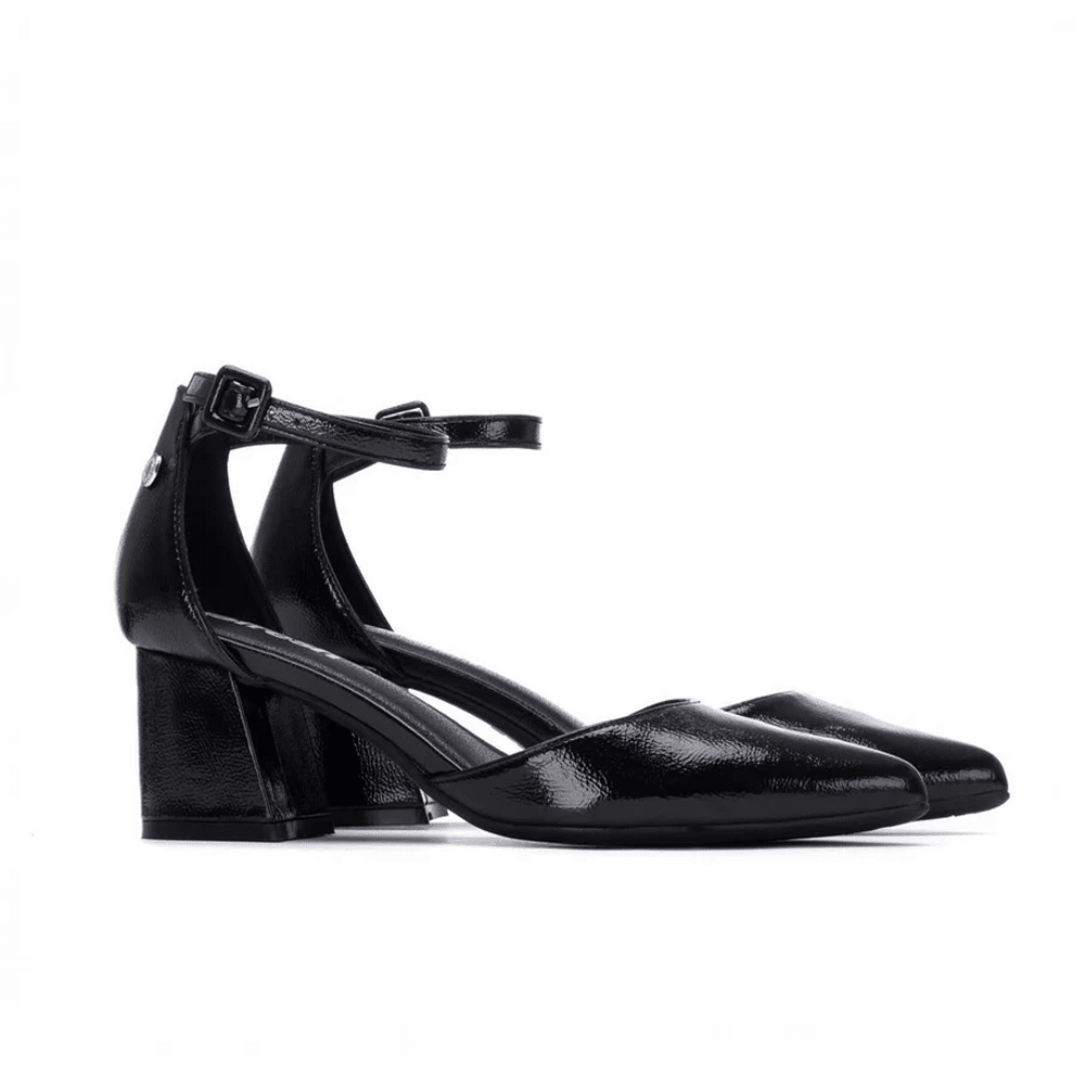 Los zapatos tacón negro mujer Refresh 175075 combinan elegancia y comodidad. Diseño abierto en acabado charol con punta afilada, correa ajustable y tacón de bloque.